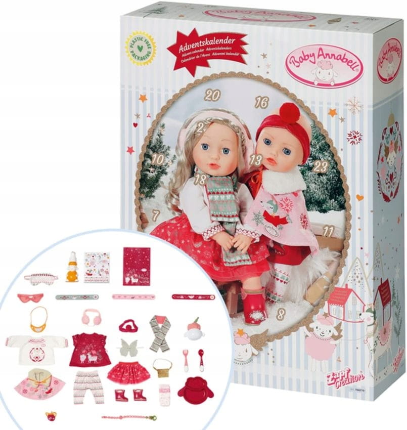 Zawartość pudełka: Kalendarz adwentowy składający się z 24 niespodzianek, składający się z ubrań i akcesoriów dla Baby Annabell