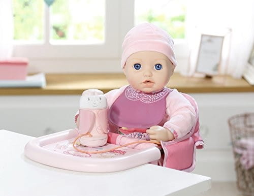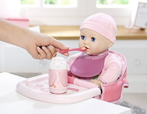 Zestaw zawiera specjalny słoiczek z pokarmem dla laleczki i łyżeczkę. Gdy trzymasz łyżkę owsianki przy ustach Baby Annabell?, możesz usłyszeć jak mała je. Jeśli laleczka nie jest bardzo głodna możesz zakręcić pojemniczek z posiłkiem ładna pokrywką z owieczką. W zestawie znajduje się również ładny śliniaczek, dzięki któremu czas karmienia jest naprawdę przyjemny. Jedzenie powinno być ucztą dla oczu, a Baby Annabell? nie chce pobrudzić całego ubrania, dlatego sztywny śliniaczek jest łatwy w czyszczeniu i doskonale ochroni strój laleczki.