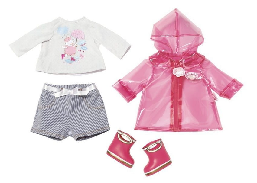 Uroczy komplet idealnie nadaje się do zabawy z laleczką. Zestaw składa się z bluzeczki z motywem owieczki, spodenek oraz płaszcza przeciwdeszczowego z kaloszami. Wszystko to w dziewczęcych kolorach. W takim zestawie twoja laleczka będzie na pewno ślicznie wyglądać!