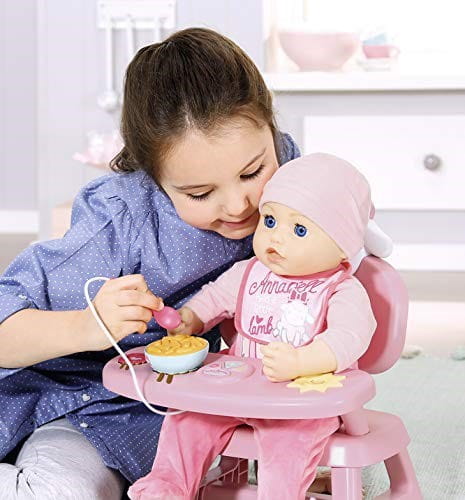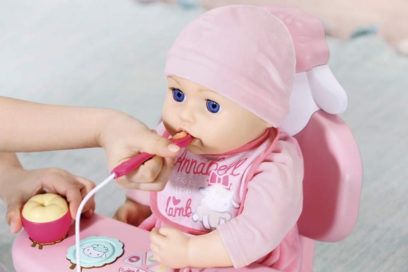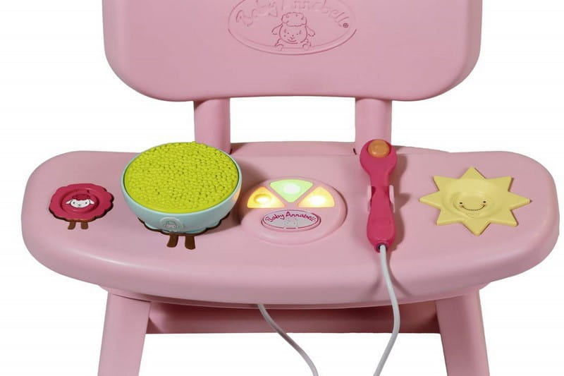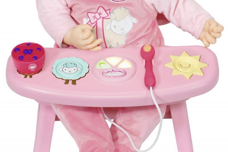 Różowe krzesło z oparciem w kształcie owieczki i stolikiem. Co może być głównym daniem? Marchewka, groszek lub ryż? Po umieszczeniu miski na odpowiedniej owieczce zobaczysz światło i usłyszysz dźwięk, czy dziecko Annabell lubi obiad czy nie.
