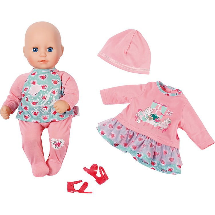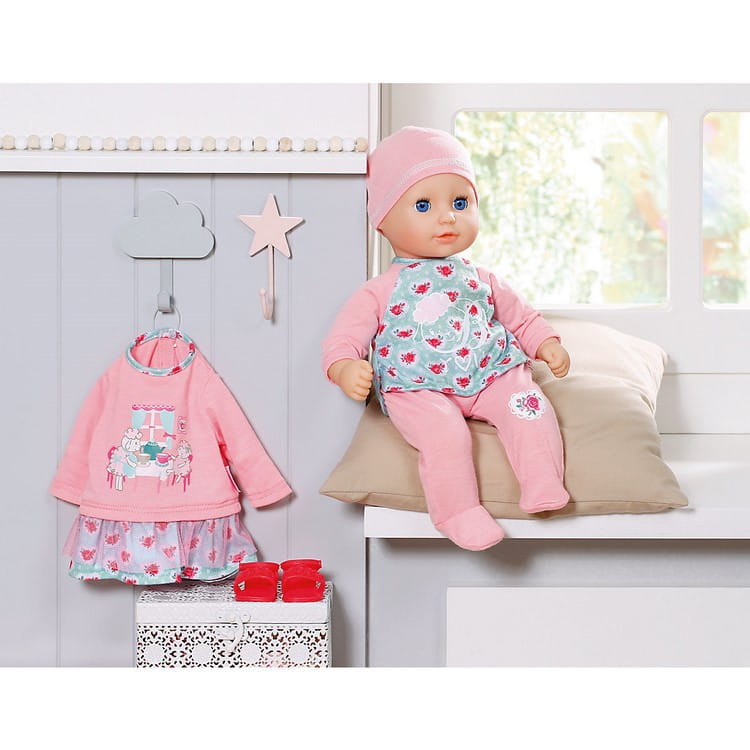 Baby Annabell Mała Annabel to urocza, nieduża lalka dla mniejszych dziewczynek, które rozpoczynają swoja przygodę z laleczkami. Lalka liczy ok. 36cm wysokości. Zestaw zawiera lalę z mięciutkim brzuszkiem i zamykanymi oczkami, którą w łatwy sposób można przebierać. Annabell ubrana jest w śpioszki w różowym kolorze z motywem różyczek. Na główce ma czapeczkę. Do dyspozycji dziewczynek dołączono także uroczą sukieneczkę z ozdobną bluzką i falbanką.