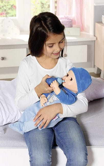 - Bogate akcesoria zapewniają dziecku długotrwałą radość z zabawy: lalka z ubrankiem i czapką, śliniaczkiem, buteleczkami, smoczkiem, łańcuszkiem
