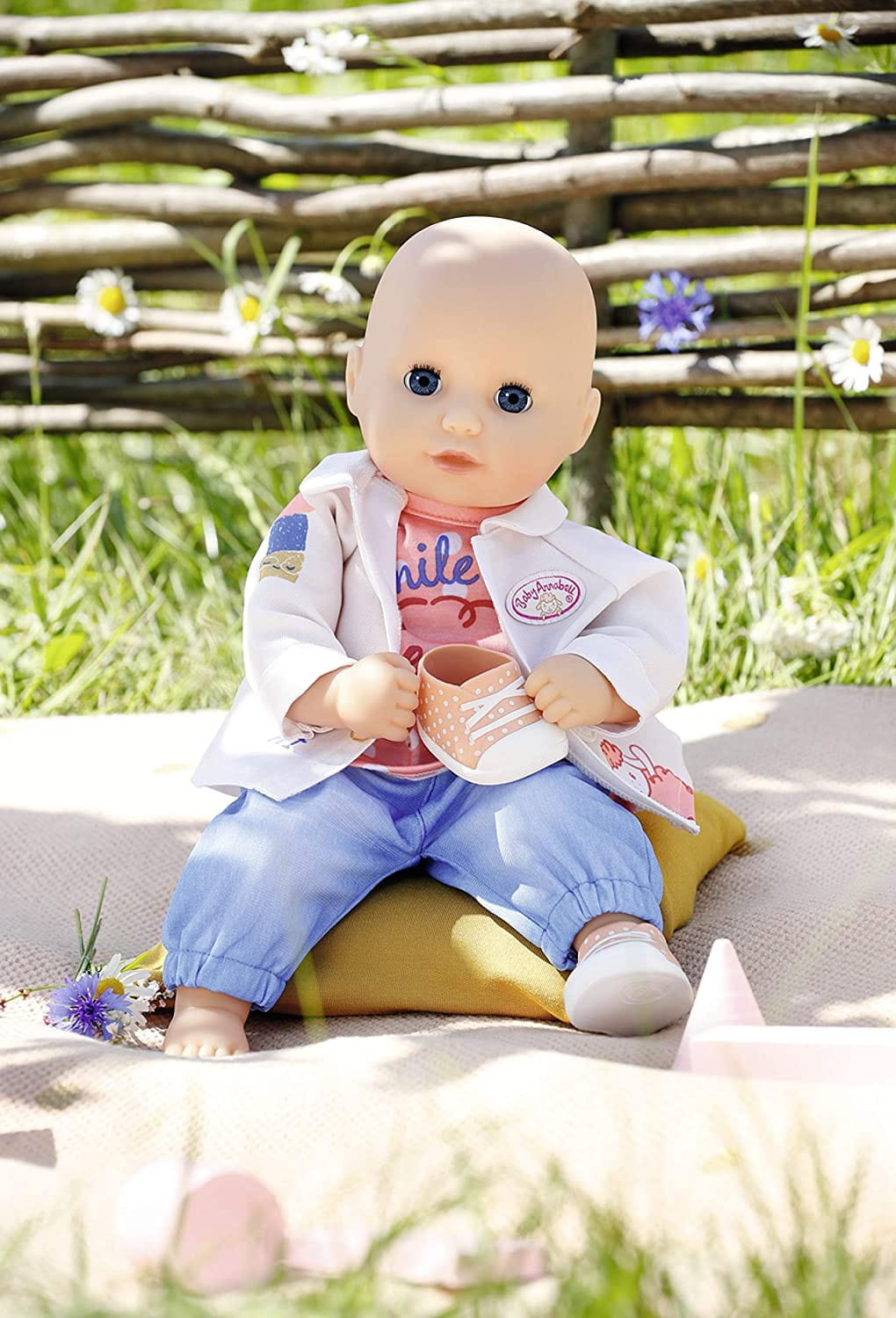 Koszulka i buty ozdobione są uroczymi białymi kropeczkami. Uśmiechająca się owca na koszulce również wydaje się dobrze bawić. Dzięki spodniom w stylu dżinsów mała Annabell może wygodnie usiąść w piaskownicy. Kiedy traci poczucie czasu na placu zabaw i wieczorem robi się zimno, po prostu wkłada kurtkę. Ten zabawny strój, wykonany w stylu easy fit można łatwo zakładać i zdejmować nawet najmniejszą dłonią.