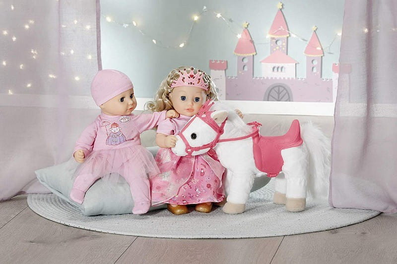 Biały kucyk ma królewski sprzęt z błyszczącą koroną, a jego zabawne, czujne uszy wystają zza niego. Jeśli naciśniesz prawe ucho, kucyk zacznie rżeć lub prychać. Jeśli naciśniesz lewe ucho, usłyszysz stukot kopyt. Mała Annabell jest całkowicie zakochana w swoim zwierzęcym towarzyszu i często całuje kucyka w jego nozdrza. Odpowiada jej odgłosami całowania. Mała księżniczka siedzi wygodnie w siodle podczas jazdy, a uchwyt na lalkę zapewnia jej potrzebną stabilność.
