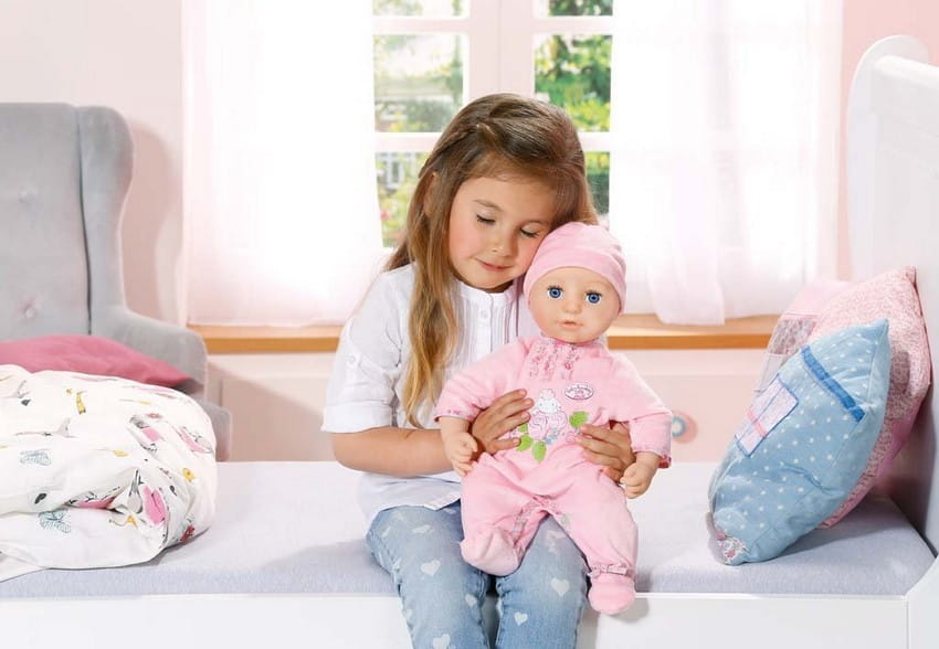 Baby Annabell to urocza, elektroniczna lalka funkcyjna, która wygląda i reaguje jak prawdziwe niemowlę i w dodatku płacze prawdziwymi łzami! Baby Annabell ubrana jest w aksamitne śpioszki w różowym kolorze z motywem owieczki. Na główce ma czapeczkę. Lalka posiada wiele funkcji, które dzieci mogą zaobserwować u niemowląt i wykorzystać podczas wspaniałej zabawy: