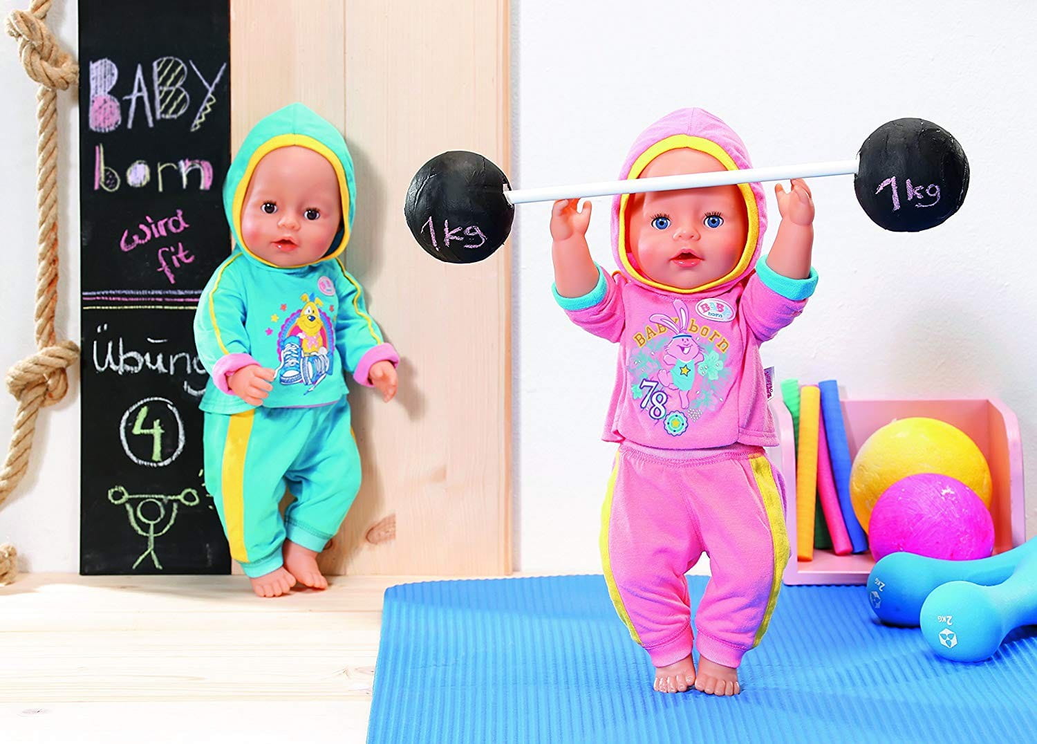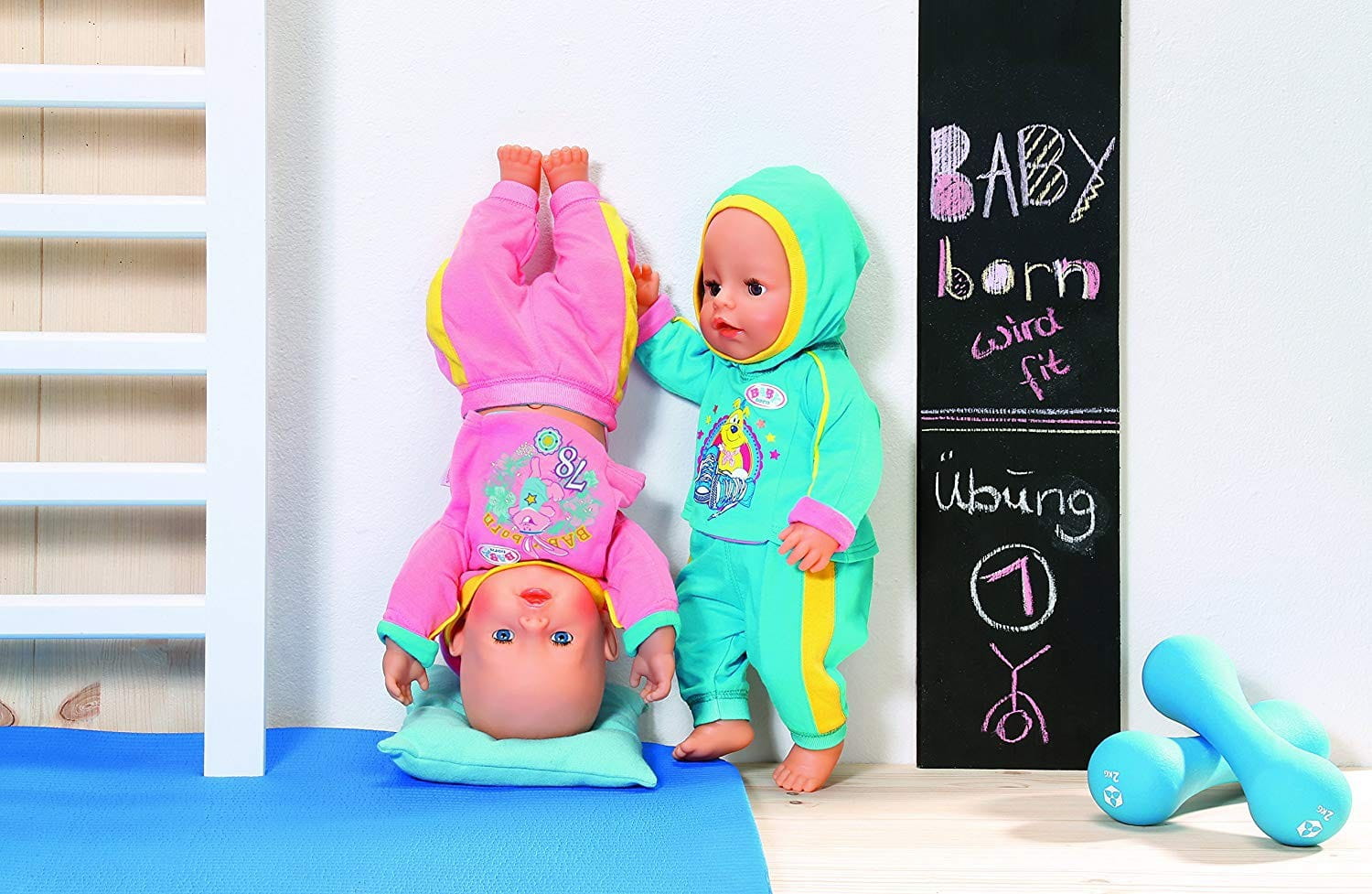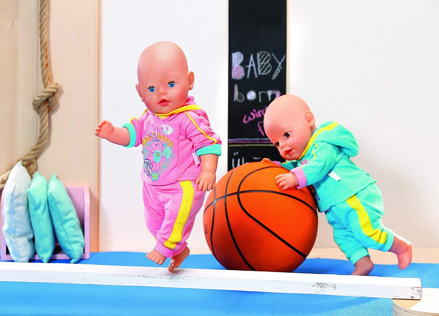 Baby born ceni sobie wygodę, dlatego często nosi sportowe ubranka. Ten kolorowy, chłopięcy dresik na pewno spodoba się każdemku chłopcowi. Zestaw składa się z bluzy z kapturem, ozdobionej aplikacją z pieskiem oraz ze spodenek. Ubranka przeznaczone dla lalek 40 - 43 cm. Zestaw nie zawiera lalki.