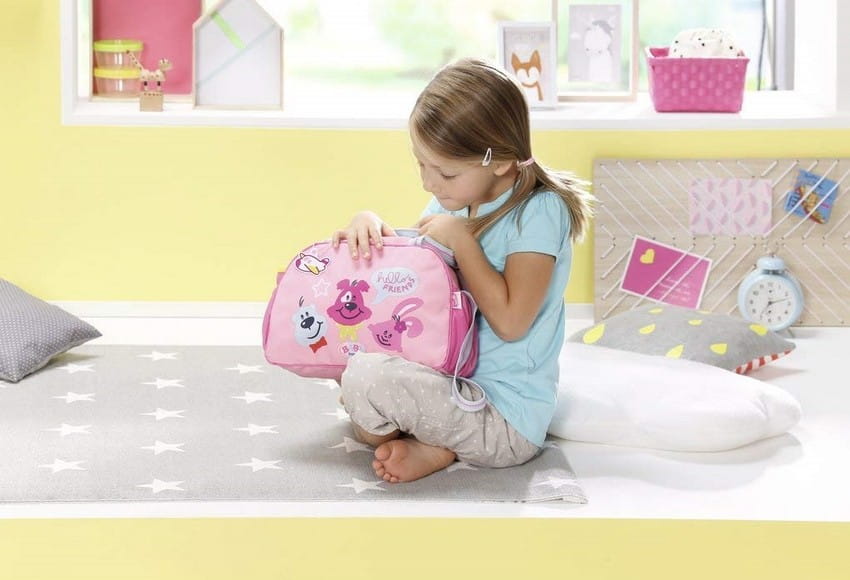 Duża i obszerna torba z przewijakiem do przenoszenia najważniejszych akcesoriów dla lalek. Wewnątrz jest dużo miejsca na matę do przewijania, różową butelkę z pudrem z żółtą pokrywką, pierścionek z perłami i gwiazdą oraz oczywiście na zapasową pieluszkę.