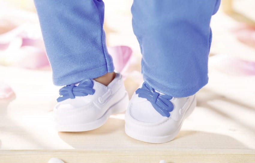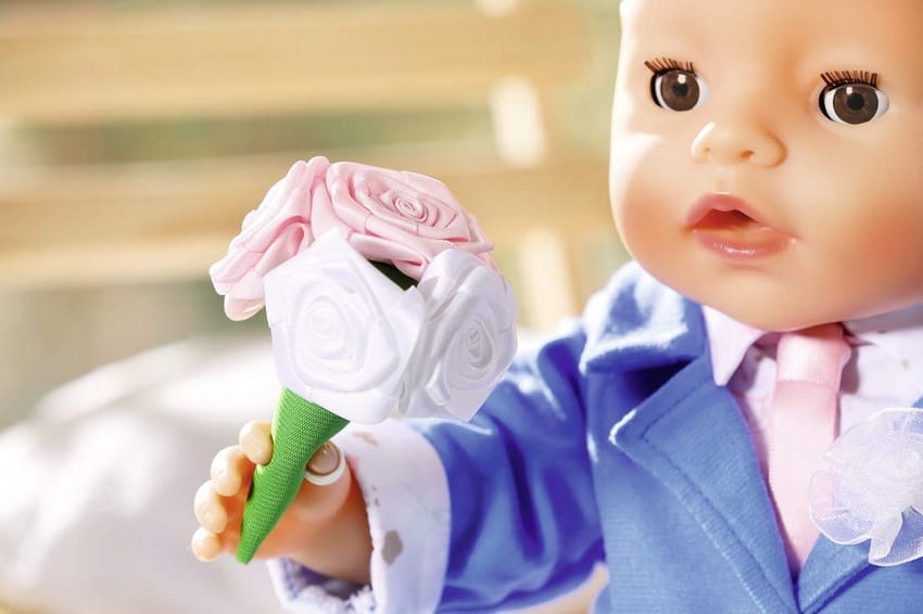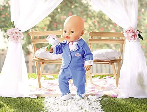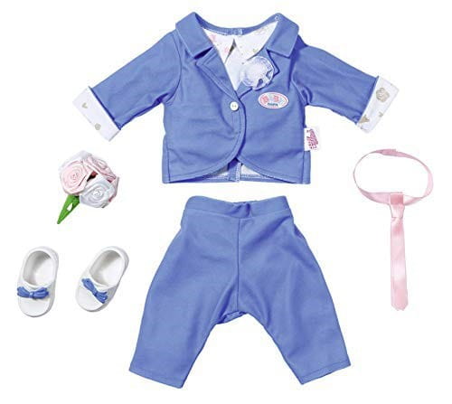 Mały pan młody nosi niebieski garnitur składający się ze spodni i marynarki z koszulą i kwiatem na odwrocie. Dzięki różowemu krawatowi wygląda wyjątkowo elegancko. Białe buty z niebieskimi kokardkami są szczególnie wygodne do tańca na weselu.