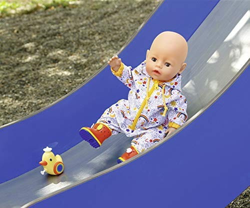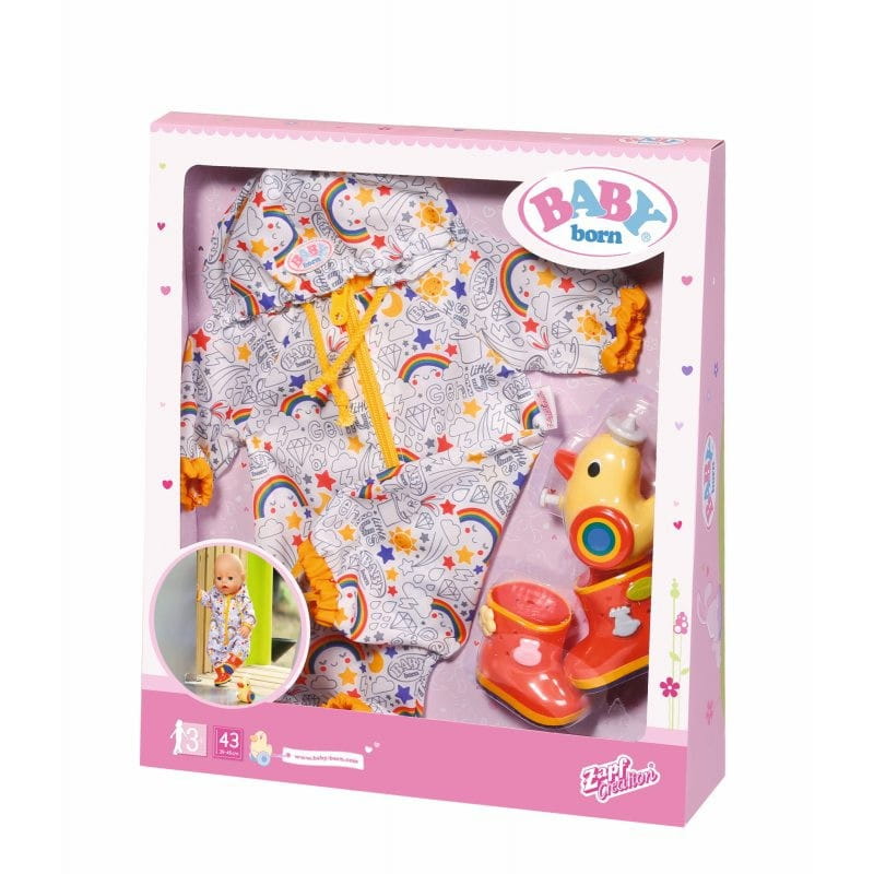 Oto fantastyczny komplet do cudownej zabawy z lalką Baby Born. "Mała mama" znajdzie tu śliczny wiosenny kombinezon z kapturem - z żółtymi lamówkami i zamkiem, wesołym motywem tęczy, chmurek, błyskawic oraz logo firmy. Do tego pomarańczowe kaloszki z przypinkami w różnych kształtach i kolorach oraz ukochana zabawka laleczki - kaczuszka Berta - z funkcją wodnego pistoletu.