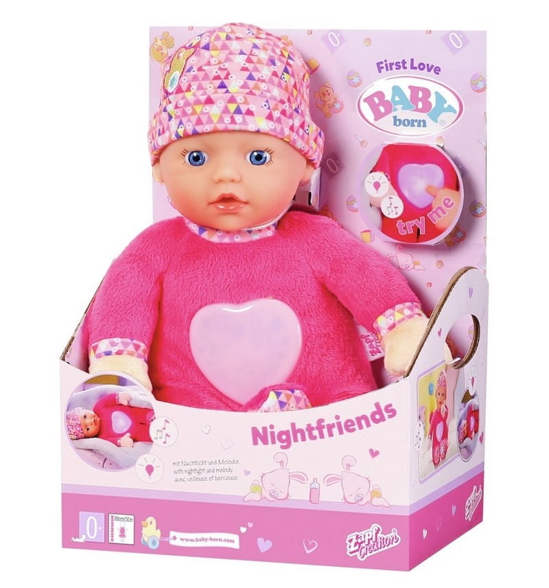 Baby born to śliczna, nieduża laleczka dla dzieci już od pierwszych dni życia. Wykonano ją z puszystej, welurowej tkaniny, a na jej miękkim brzuszku znajduje się świecące serduszko, które po naciśnięciu uruchamia funkcje dźwiękowe, wygrywając spokojną melodię i rozbłyskując wrzosowym światłem. Laleczka ma różowe śpioszki i czapeczkę w drobne, wielobarwne trójkąty. Melodia i delikatne światełko pomaga maluszkom wyciszyć się i zasnąć.