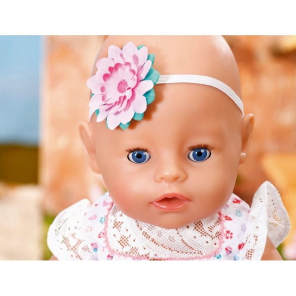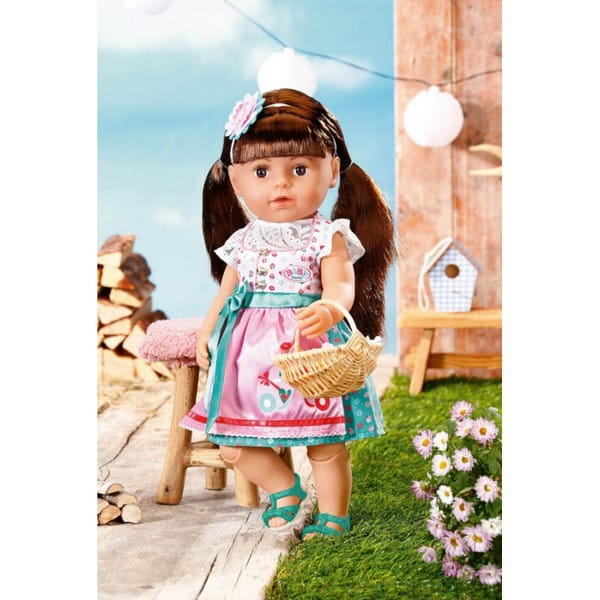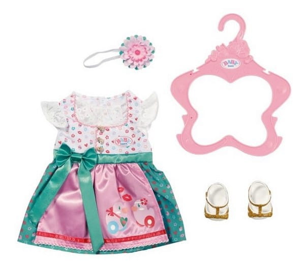 Pięknie zaprojektowany i ozdobiony uroczymi detalami: drukowany cyklamen, koronkowe rękawy, różowy fartuch z zieloną kokardką i pasującą opaską do włosów. Idealne ubranie dla lalki Oktoberfest.