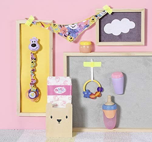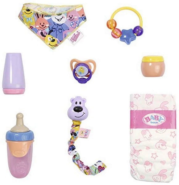 - Zakres dostawy: zestaw akcesoriów dla lalek składający się z smoczka Magic Eyes z łańcuszkiem na smoczek, pieluchy, pierścienia do zabawy, pudru, kremu, butelki i chustki na szyję