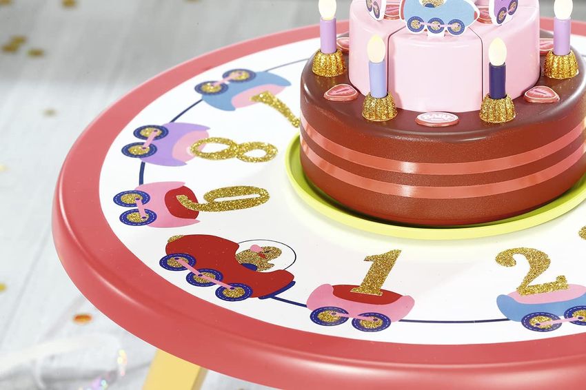 Stół Urodzinowy BABY born Happy Birthday z efektami świetlnymi i dźwiękowymi. W zestawie 3 krzesła, 3 talerzyki, 3 widelczyki, 3 kubeczki, 2 arkusze naklejek, 1 obrotowa taca i 1 tort urodzinowy ze świeczkami cyframi i przypinkami.