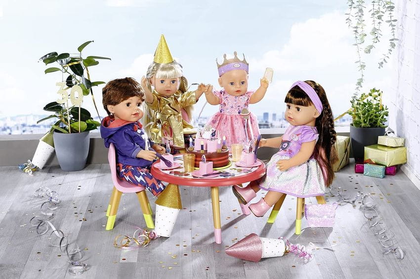BABY born z przyjaciółmi siedzą i za pomocą widelczyków jedzą z talerzyków tort, piją wodę z kubeczków i wspominają te wszystkie 30 lat od kiedy istnieje lalka BABY born.