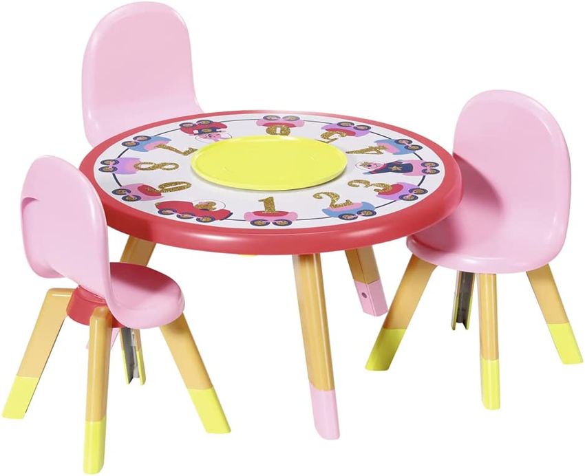 BABY born i jej ulubieni goście zajmują miejsca przy stole, gotowi na rozpoczęcie imprezki. Trzy krzesła i stolik w stylu skandynawskim wyglądają, jakby były z drewna. Stół udekorowany jest urodzinowymi ozdobami. Pośrodku ma obrotową tacę na tort. Na mebelki można ponadto nakleić naklejki.