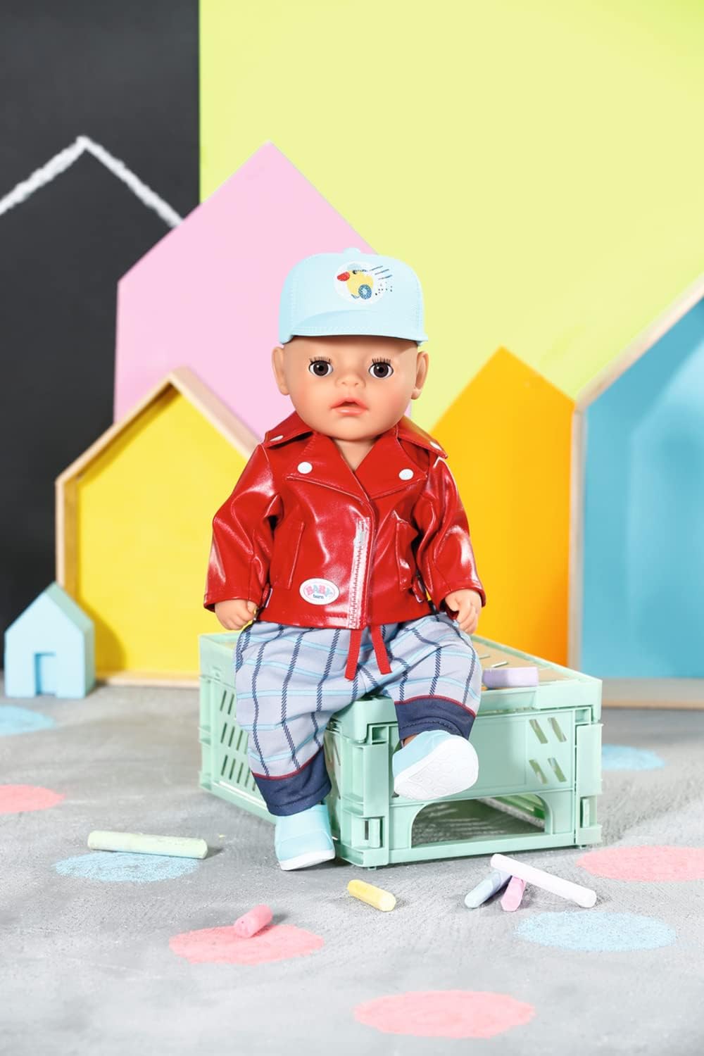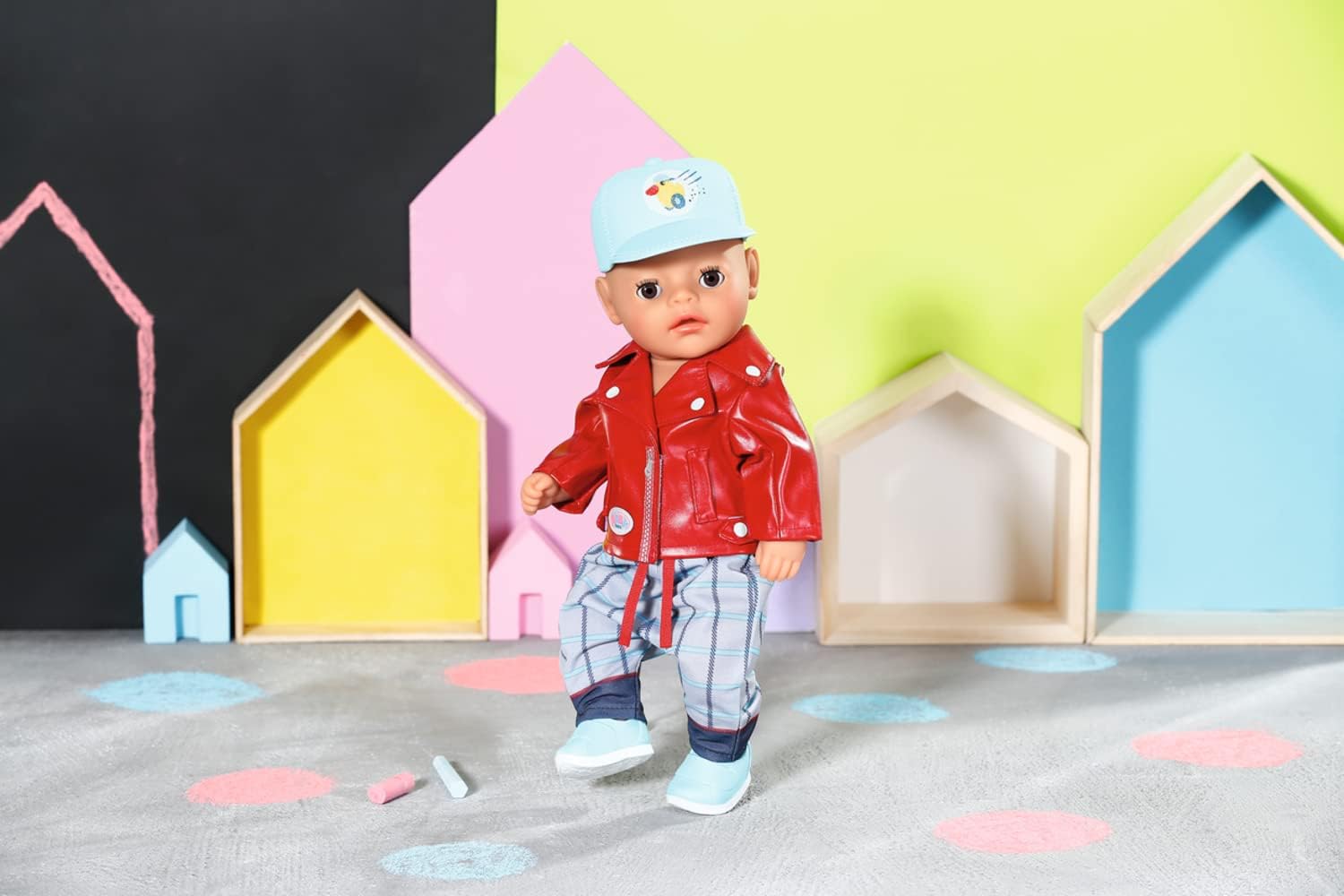 BABY Born Little Cool Kids Outfit to super modny strój dla małych lalek urodzonych niemowląt, z efektowną czerwoną skórzaną kurtką z nadrukiem niedźwiedzia z tyłu, szaro-niebieskie spodnie haremowe, niebieskie trampki, czapkę baseballową i pasujący wieszak na ubrania.