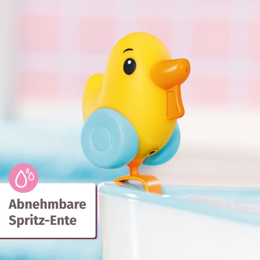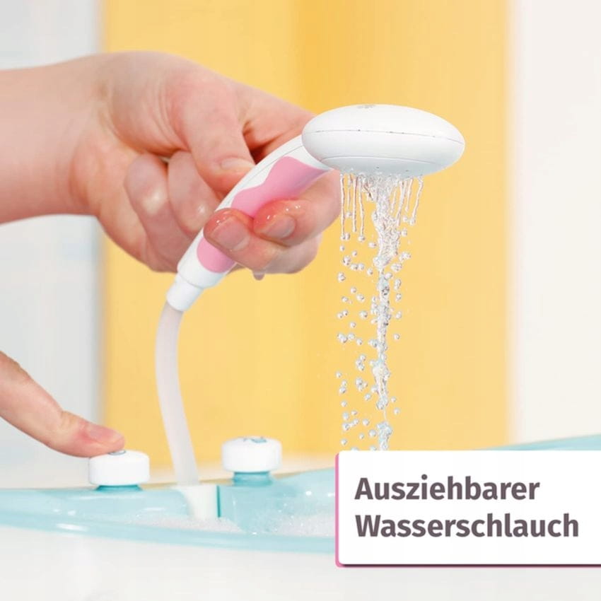 WYSUWANY WĄŻ DO WODY: Głowicę prysznicową można przechylić w kierunku wanny, aby żadne krople nie pomyliły się. Wąż można wyciągnąć, aby wziąć prysznic BABY Born dokładnie