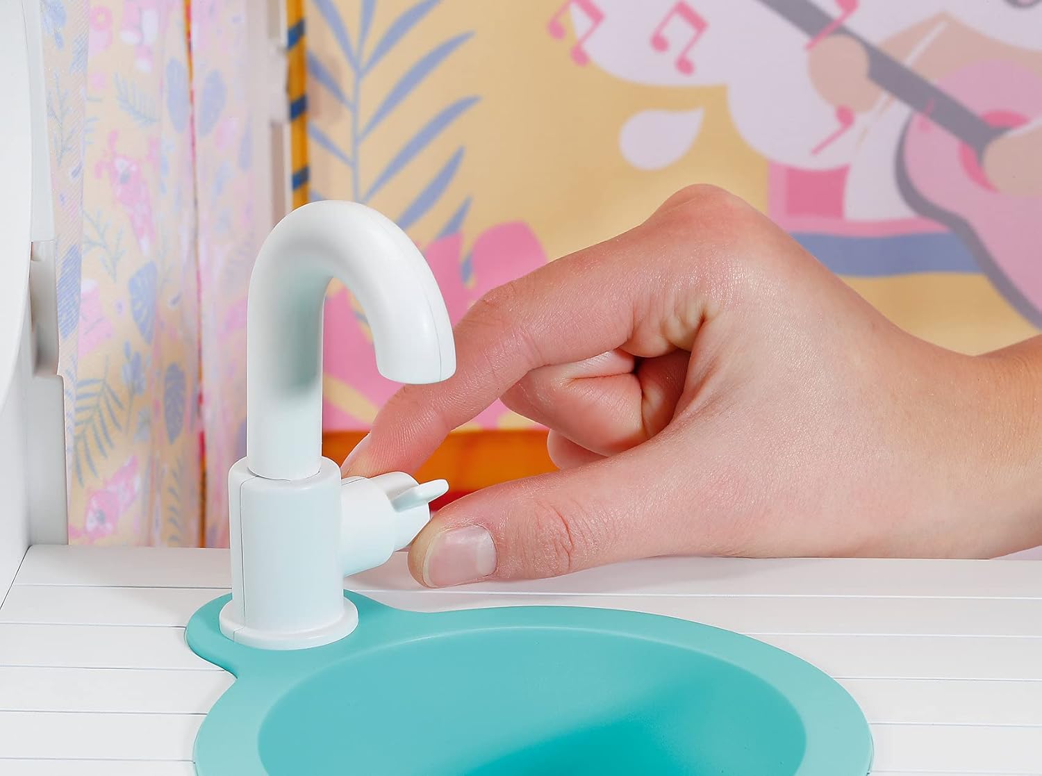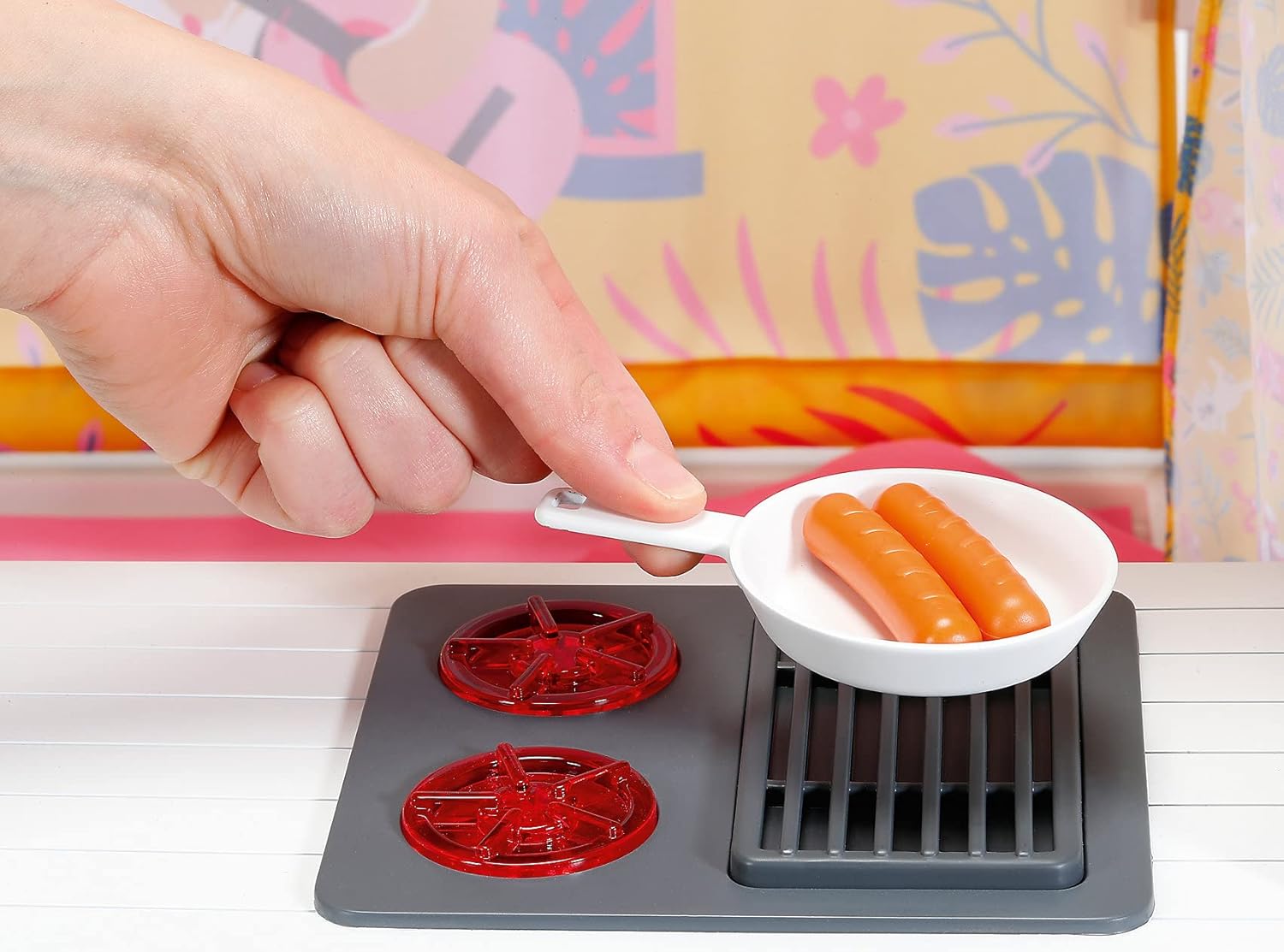 Kuchnia z efektami świetlnymi i dźwiękowymi: interaktywny domek dla lalek posiada zlew z szumem wody oraz płyty kuchenne i grill z dźwiękami światła i skwierczenia