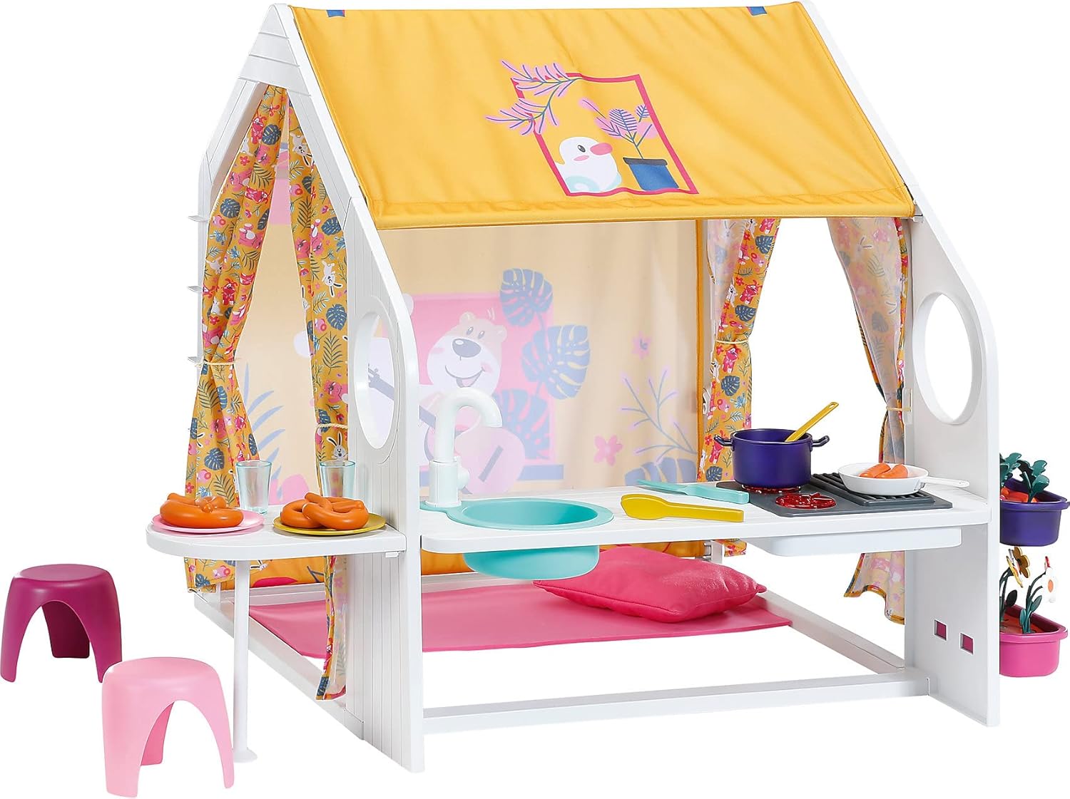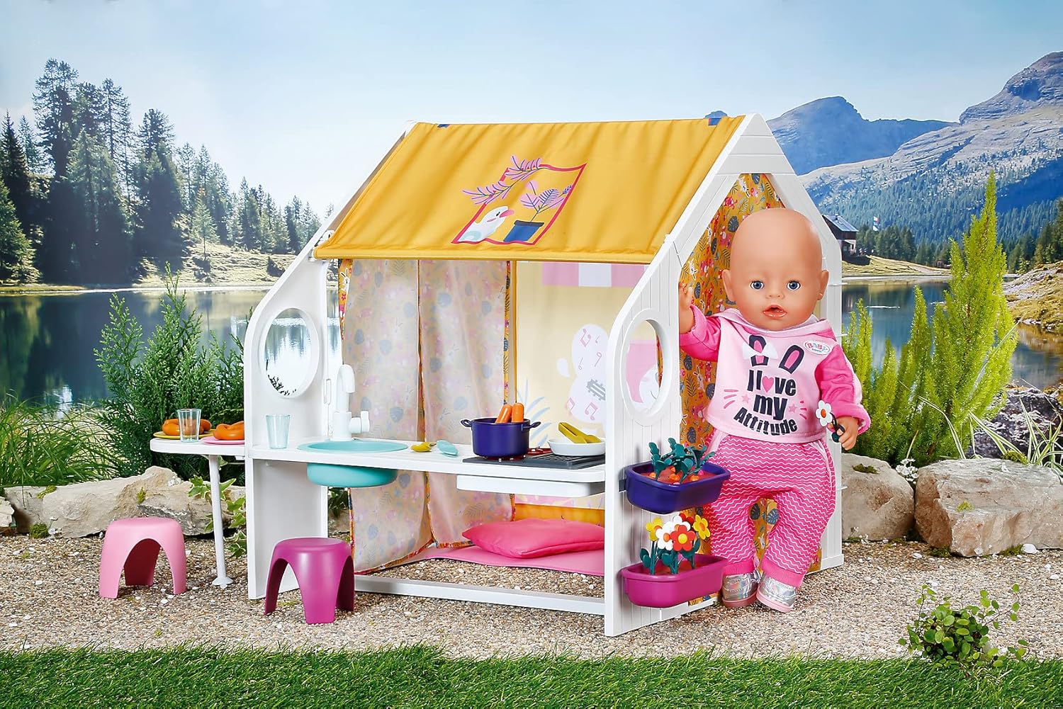 Baby Born Weekend House to interaktywny domek dla lalek, który zapewni Twojemu dziecku wiele godzin wspaniałej zabawy. Wyprodukowany przez renomowaną markę BABY Born domek posiada wiele efektów świetlnych i dźwiękowych, w tym zlew z szumem wody, płyty kuchenne, grill z dźwiękami światła i skwierczenia oraz panele boczne, które można dowolnie otwierać lub zamykać. Rozbudowany zestaw akcesoriów do kempingu, w tym 2 krzesła, zastawa stołowa, garnki, precle i kiełbaski, zapewni dziecku wiele możliwości zabawy wraz z lalką.