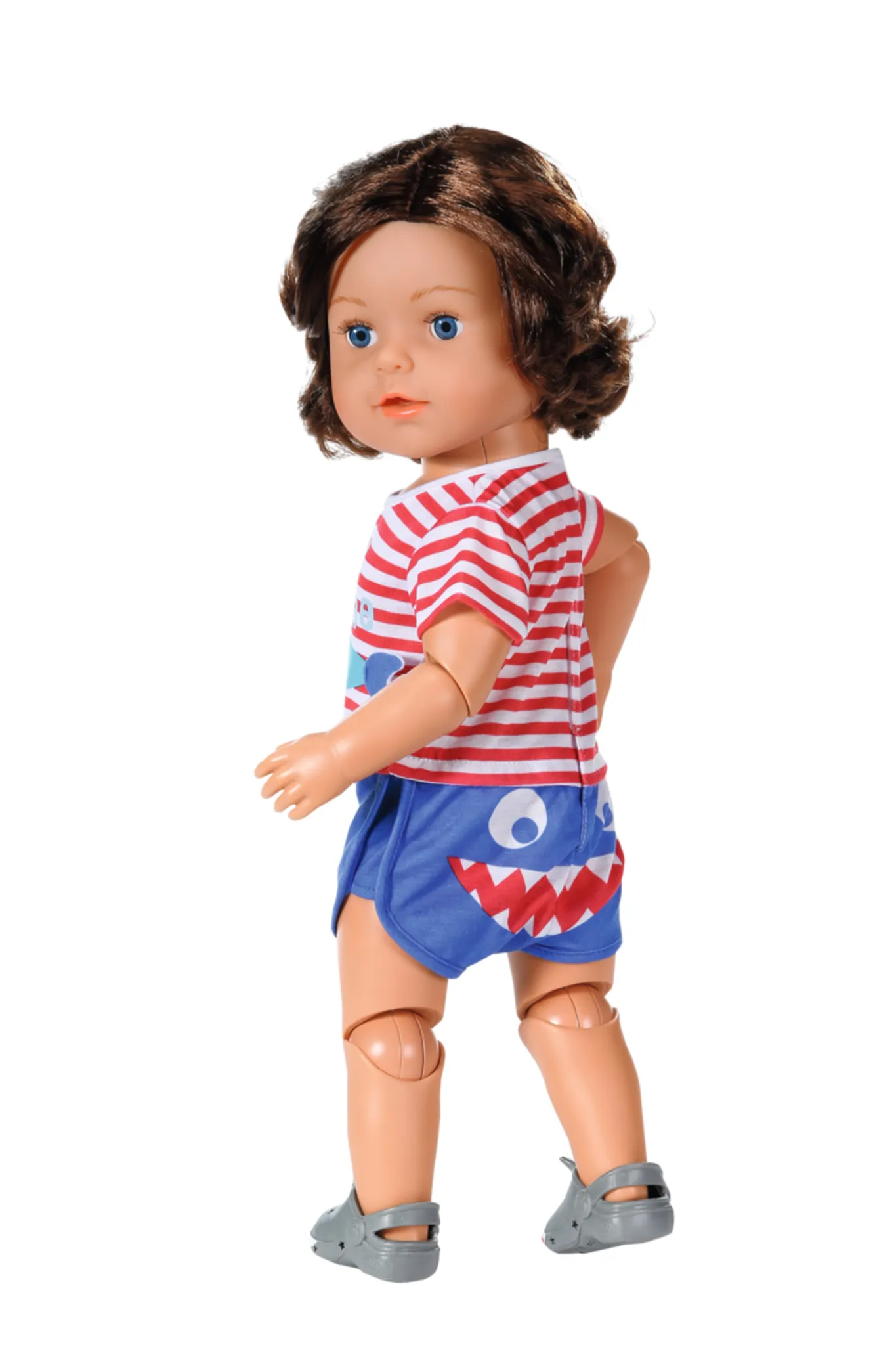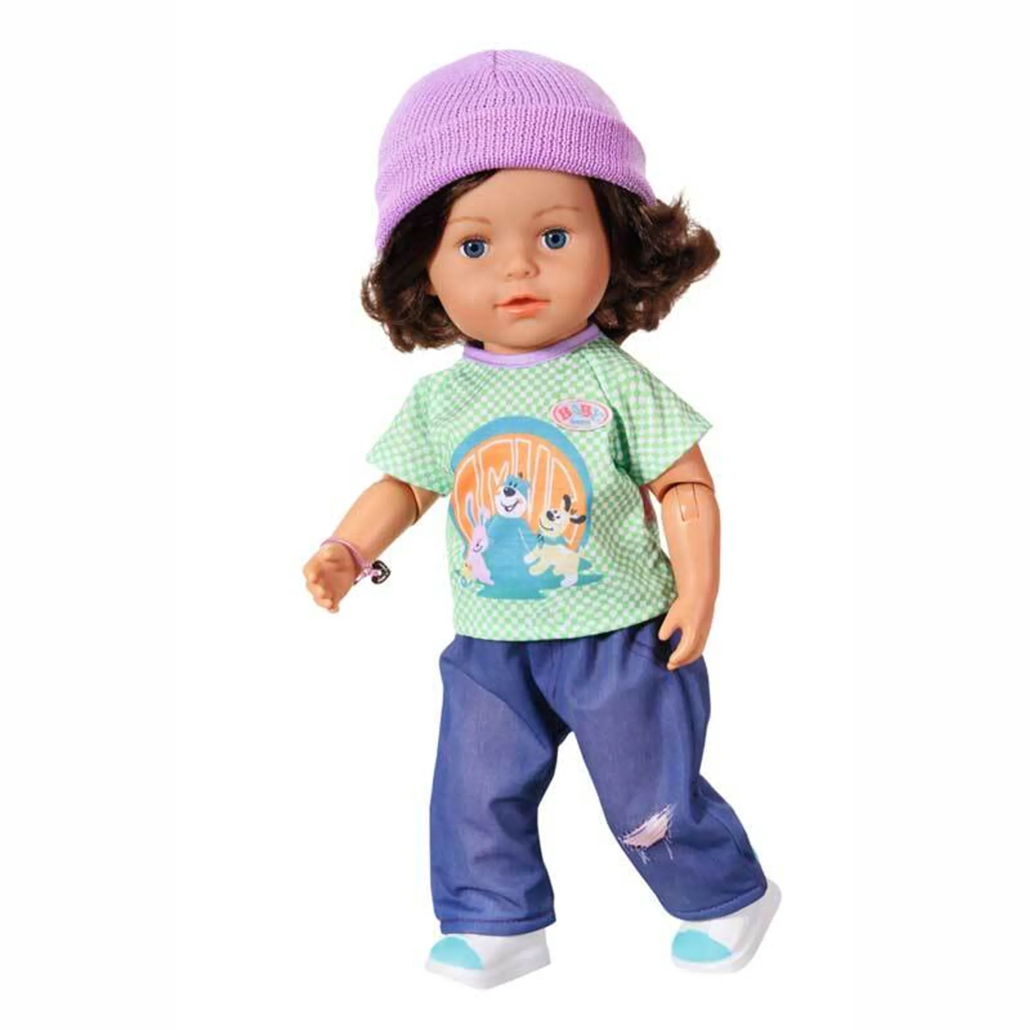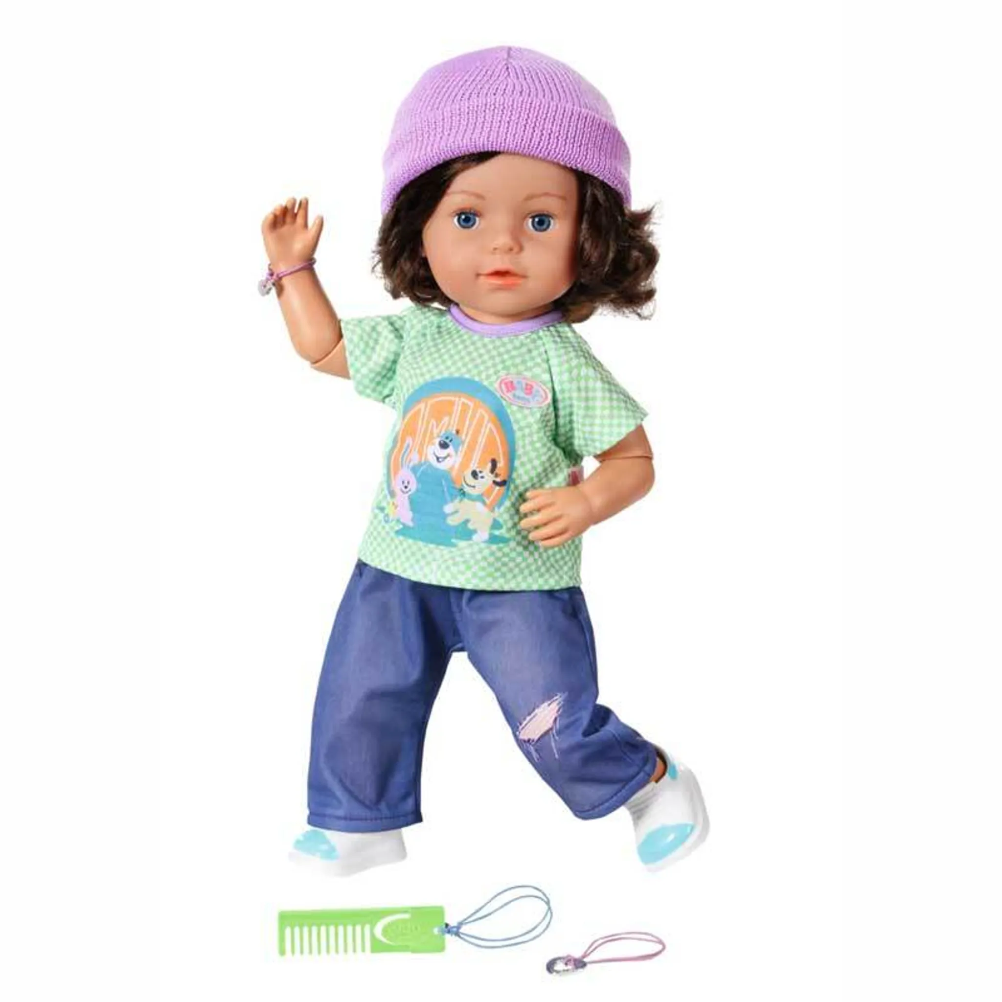 BABY born Brother. Siedem realistycznych funkcji zapewnia wspaniałą zabawę. Wszystko od BABY born pasuje do niego. Urozmaicona zabawa (w odgrywanie ról) z BABY born pobudza wyobraźnię i, jak udowodniono, wspiera rozwój umiejętności społecznych i wartości, takich jak odpowiedzialność, komunikacja i empatia. Nie wymaga baterii. BABY born Brother Style & Play 43 cm z koszulą, spodniami, butami i czapką. W zestawie grzebień i po 1 bransoletce przyjaźni dla dziecka i lalki.
