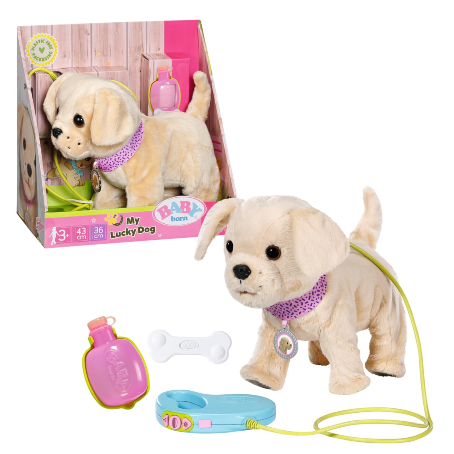 Steruje się nim za pomocą przycisków sterujących na smyczy. Wysokiej jakości akcesoria do lalek BABY born. Dla rozszerzonej, zróżnicowanej i długotrwałej zabawy w grach. Wymagane baterie (brak w zestawie). BABY born My Lucky Dog zawiera obrożę z zawieszką, smycz, butelkę z poidłem i kość.