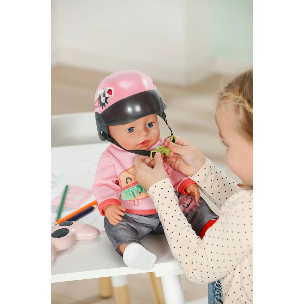 Bezpieczeństwo przede wszystkim! Zanim BABY born ruszy w miasto na swojej elektrycznej hulajnodze, nakłada najpierw stylowy różowy kask. Gadżet z zabawną grafiką pasuje na lalki Baby born, które mierzą czterdzieści trzy centymetry – w tym także na lalki z serii Siostrzyczka i Braciszek. Dzięki odpowiedniemu dopasowaniu, regulowanemu paskowi pod brodę i opuszczanej szybce z plastiku, kask pewnie trzyma się na głowie lalki, zapewniając bezpieczeństwo i wygodę.