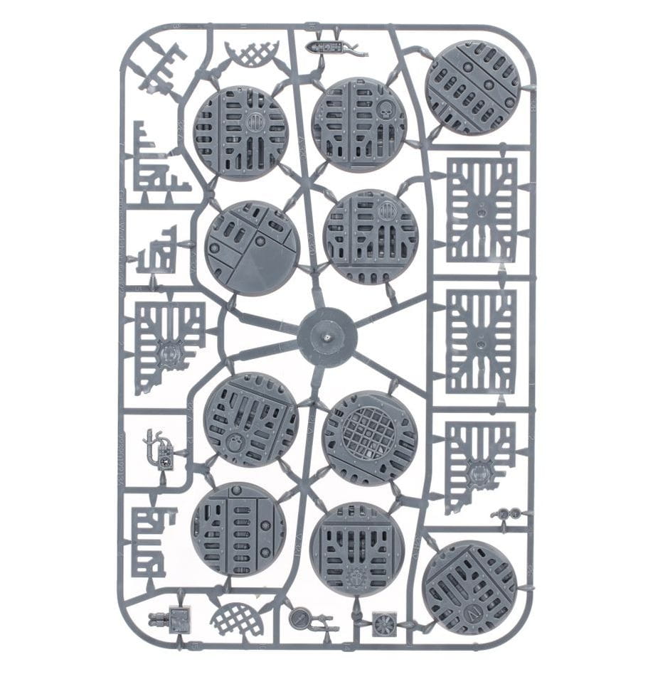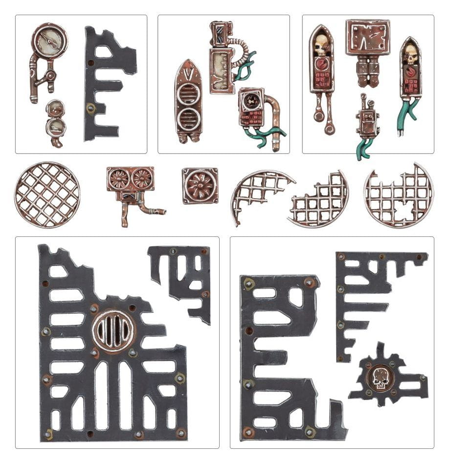 Oprócz podstawek, ten zestaw zawiera mnóstwo elementów ponurego i przemysłowego materiału bazowego, aby dodać detali i elementów narracyjnych do twoich miniatur, takich jak sekcje pomostu, uszkodzone panele kratki, porzucone wentylatory, zniszczone wskaźniki i zużyte przekaźniki vox.