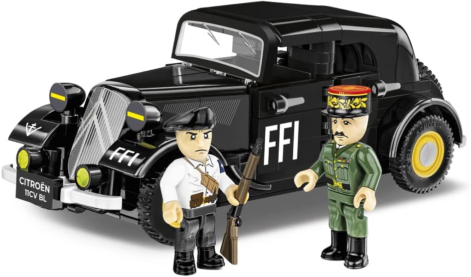 Oryginalne auto było produkowane w latach 1937-1957. Wyróżniało się samonośnym nadwoziem i przednim napędem. Powszechnie przyjęta i zarazem nieoficjalna nazwa samochodu to Traction Avant, oznaczająca z języka francuskiego „napęd przedni”. Nasz model wyposażony jest w historyczne emblematy Francuskich Sił Wewnętrznych (fr. Forces françaises de l’Intérieur). FFI była jednolitą organizacją jednoczącą wszystkie stronnictwa francuskiego Ruchu Oporu w czasie II wojny światowej! Integralną częścią zestawu jest figurka specjalna Generała Charlesa Delestraint. Był to słynny generał, który czynnie działał w Resistance i organizował ruch oporu w Lyonie. Po tajnej wizycie w Londynie miał przewodzić Armée secrète. Został aresztowany przez gestapo i rozstrzelany w Dachau 19 kwietnia 1945 roku. Obok generała znajdziemy też szeregowego członka żołnierza francuskiego ruchu oporu (Resistance) w charakterystycznym uniformie i z opaską na ręku! Zestaw uzupełniają ekskluzywna czarna, klockowa podstawka ekspozycyjna pod samochód z nadrukowaną nazwą modelu.
