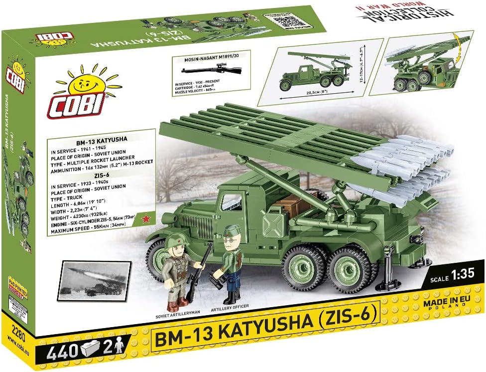 Zestaw ze słynną wyrzutnią rakiet BM-13 KATIUSZA został opracowany w skali 1:35 pasującej do figurek COBI i składa się z 440 klocków konstrukcyjnych. Zastosowanie najnowszych elementów z katalogu COBI umożliwiło wierne odtworzenie charakterystycznych kształtów oryginalnego pojazdu. Funkcjonalności modelu to: obracające się koła wyposażone w opony, regulacja nachylenia wyrzutni , otwierana kabina pojazdu i odczepiane rakiety!