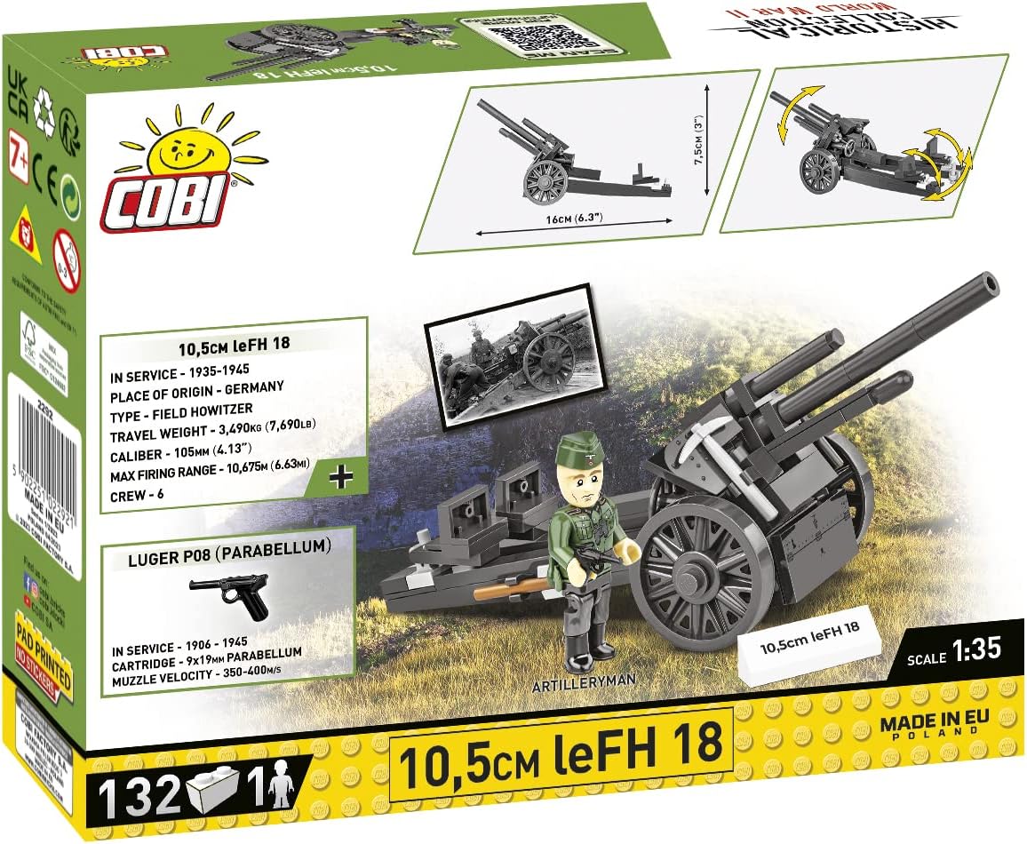 Posiada ruchomą lufę i łoże na kołach z rozstawnymi ogonami. Do zestawu dołączona jest figurka niemieckiego artylerzysty uzbrojonego dodatkowo w pistolet P08 Parabellum. W komplecie znajduje się tabliczka z nazwą modelu. Zestaw uzupełnia kolekcję z okresu drugiej wojny światowej przeznaczoną dla pasjonatów historii, techniki wojskowej oraz entuzjastów najwyższej jakości modelarstwa klockowego!