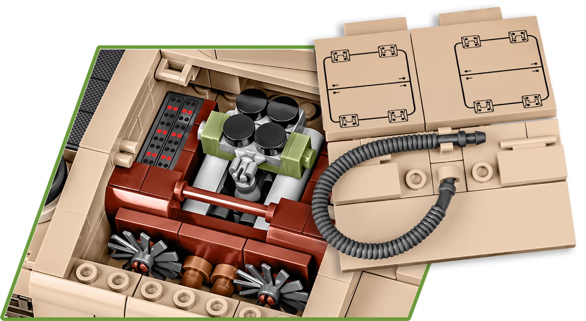 Zupełnie nowy model stworzony z klocków konstrukcyjnych COBI posiada wiele ruchomych elementów takich jak: otwierane włazy, ruchomą lufę działa, czy obracające się koła i gąsienice w nowym rozmiarze! Na uwagę zasługuje opcja zbudowania dwóch wersji działa (2in1). Dodatkowe elementy umożliwiają budowniczemu wybór pomiedzy długo i krótkolufową wersją czołgu! Duża ilość szczegółowych nadruków odzwierciedla ważne detale pojazdu! Klapy serwisowe można podnieść, aby zobaczyć atrapę silnika zamontowanego wewnątrz pojazdu. Zaletą zestawu jest także bardzo solidna konstrukcja, która wiernie odzwierciedla oryginalne kształty swego historycznego pierwowzoru. Model znakomicie sprawdza się jako element kolekcji dojrzałych oraz tych młodszych pasjonatów historii i broni pancernej. W zestawie znajdują się figurki niemieckiego żołnierza i mechanika.