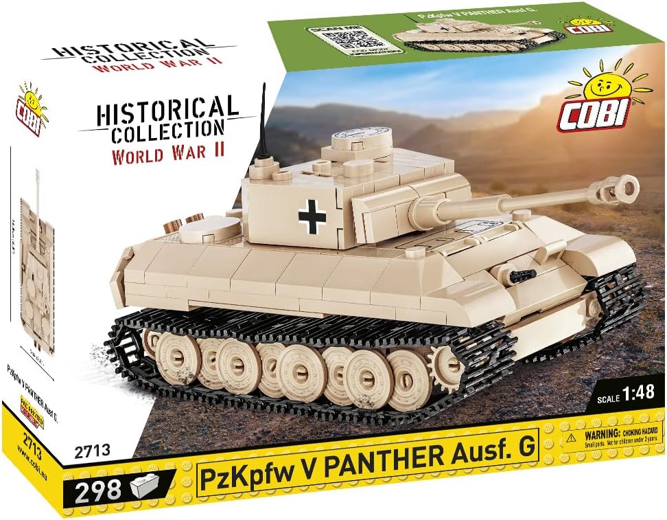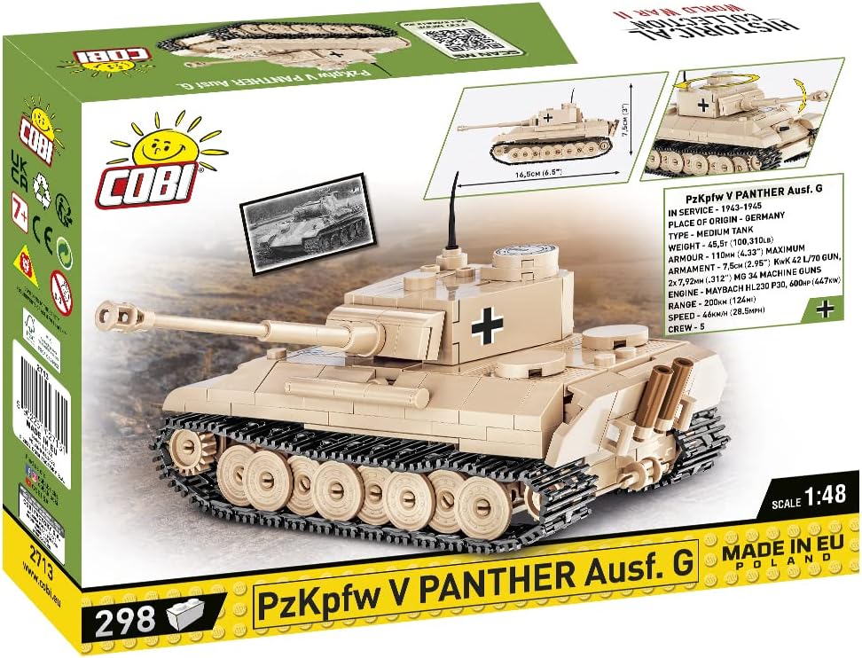 Klockowa Pantera została odwzorowana z dbałością o szczegóły w modelarskiej skali 1:48. Posiada ruchome elementy takie jak: wieża i lufa działa oraz obracające się koła i gąsienice. Zaletą zestawu składającego się z 298 elementów jest solidna konstrukcja, która wiernie odzwierciedla oryginalne kształty swego historycznego pierwowzoru. Nasz miniaturowy czołg został pokryty wysokiej jakości nadrukami, które się nie ścierają. Pantera uzupełnia naszą serię miniaturowych czołgów wykonanych w skali 1:48, które zmieszczą się w każdej kolekcji fana historii i techniki wojskowej zbudowanej z polskich klocków konstrukcyjnych COBI.