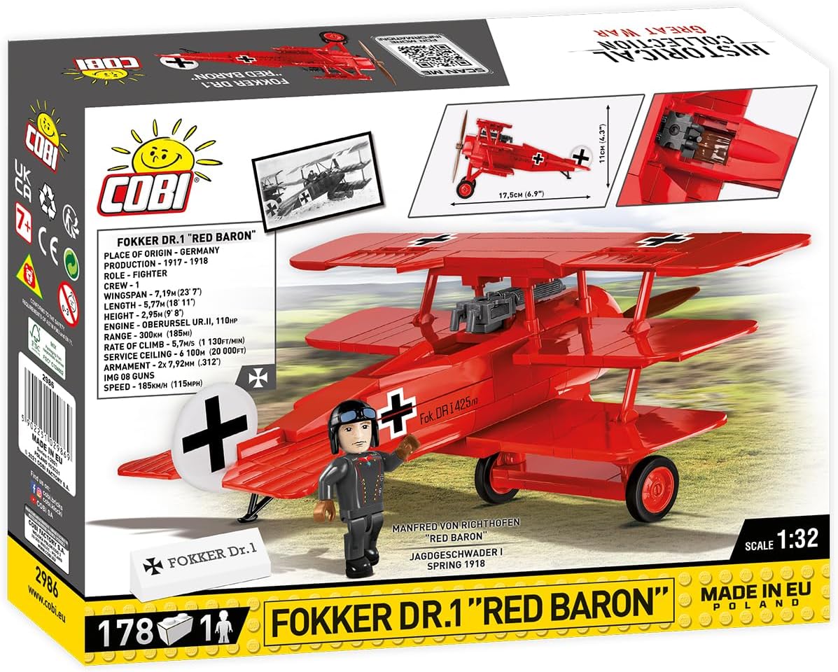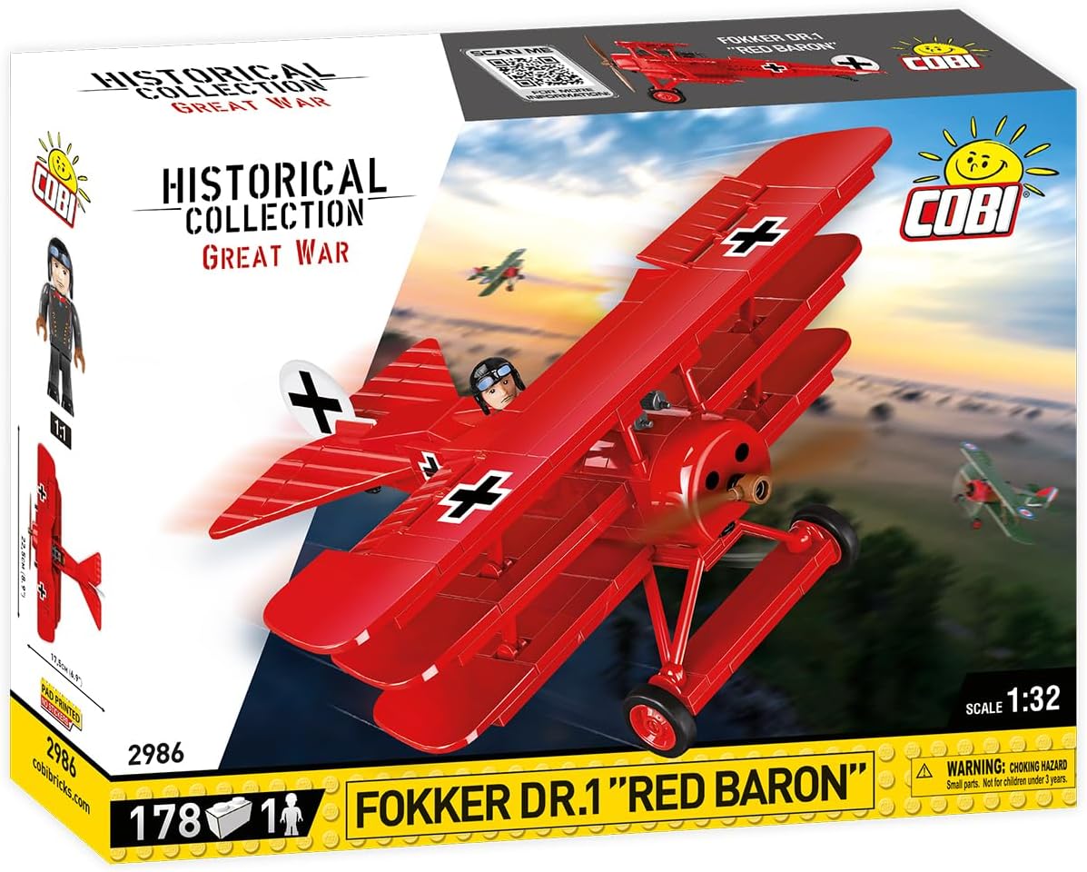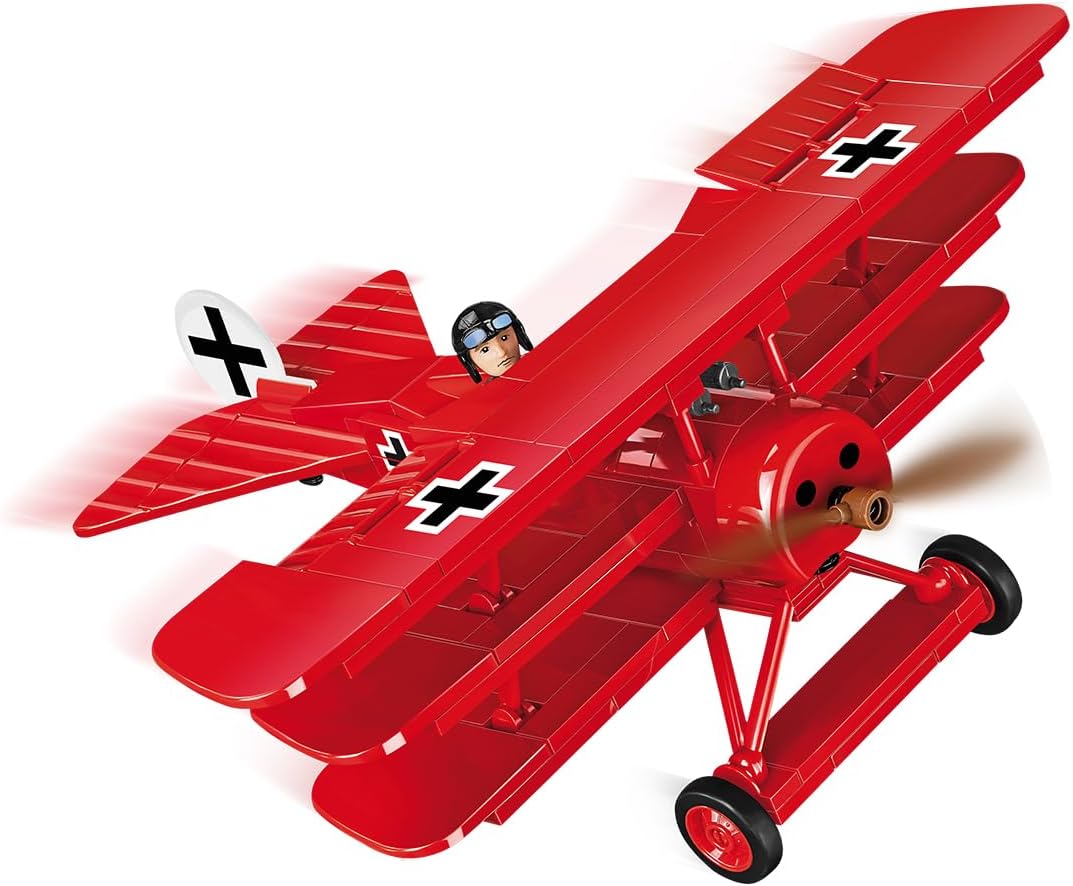Model z klocków konstrukcyjnych COBI starannie odtwarza w nowej skali 1:32, historyczny samolot z okresu Wielkiej Wojny. Ma ruchome śmigło, koła, oraz lotki skrzydeł. Wysokiej jakości nadruki doskonale odtwarzają historyczne oznaczenia samolotu. Całkowicie zrezygnowaliśmy z naklejek! Solidna konstrukcja sprawia, że jest to model idealny zarówno do zabawawy, jak i ekspozycji. Model zawiera rewelacyjną figurkę pilota: słynnego Manfreda von Richthofena zwanego “Czerwonym Baronem”. Figurkę pilota w charakterystycznym mundurze oficerskim można posadzić w kokpicie za sterami samolotu uzbrojonego w dwa karabiny maszynowe. Całość zestawu uzupełnia klocek z nadrukowaną nazwą samolotu.