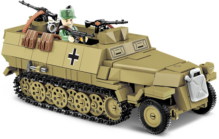 Transporter opancerzony Sd. Kfz. 251 Ausf. D został wiernie odtworzony przy użyciu klocków Cobi. Zestaw zawiera zupełnie nowy kolor klocków, wprowadzony w celu jeszcze lepszego odwzorowania modeli historycznych. Pojazd jest wyposażony w ruchome koła z prawdziwymi oponami. System torów, składający się z realistycznych połączeń klockowych, działa i zachowuje się jak prawdziwy, gdy pojazd jest w ruchu. Otwierane tylne drzwi, dwa karabiny maszynowe i dodatkowe akcesoria uatrakcyjniają zabawę transporterem. Całość uzupełnia figurka grenadiera czołgowego z dwustronnym nadrukiem. Żołnierz jest wyposażony w nakrycie głowy, klocek symulujący maskę przeciwgazową i manierkę, pas na broń, karabin szturmowy MP 40 i granatnik przeciwpancerny Panzerfaust.