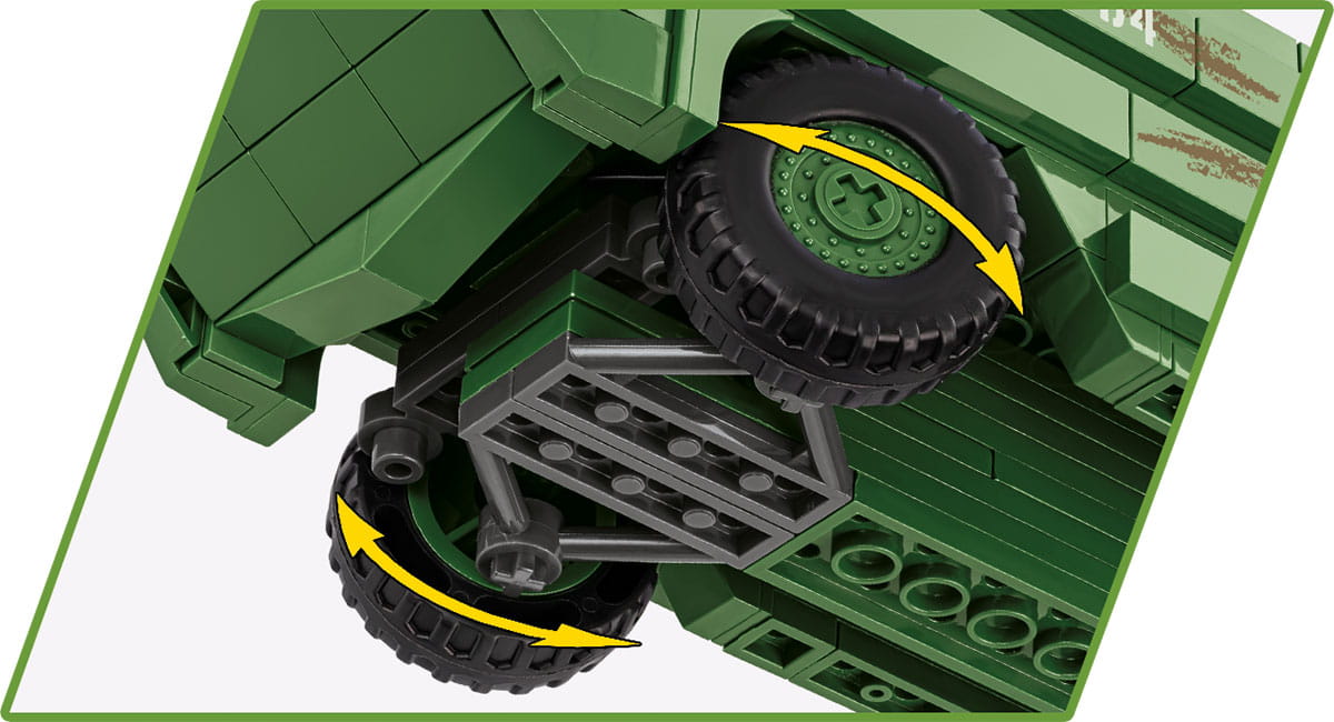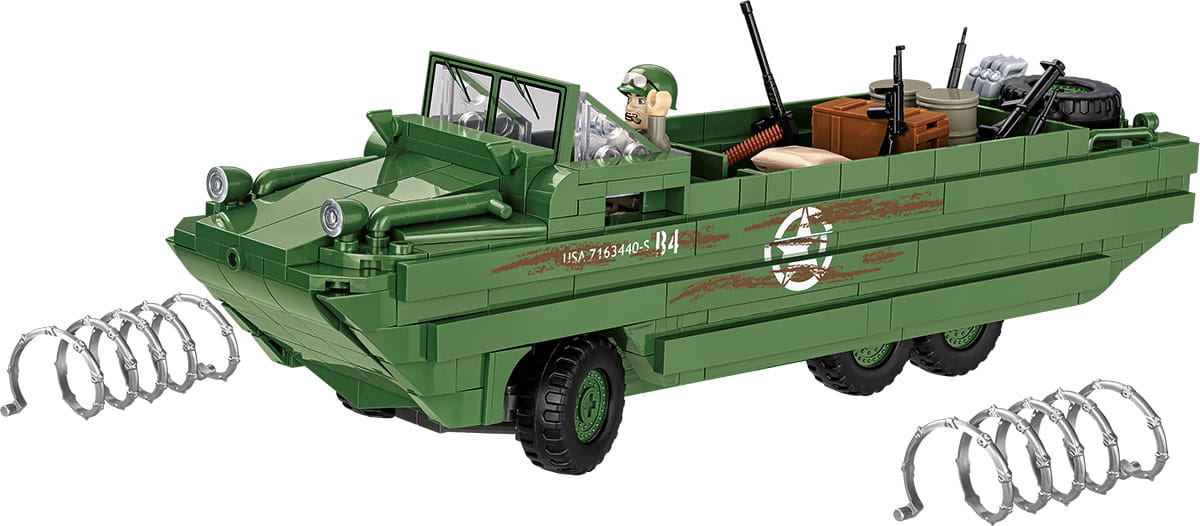 Nasz model składa się z 508 wysokiej jakości elementów i zawiera nadruki, które nie ścierają się nawet podczas intensywnego użytkowania. Model został wyposażony w skrętne koła, które znacznie podnoszą atrakcyjność zestawu. Pojazd transportowy nie może obyć się bez ładunku. Dlatego też amerykański żołnierz kierujący amfibią przewozi mnóstwo akcesoriów, które z radością wykorzysta każdy fan klocków. Bazooka, karabin Browning, Garand, Thomson i M1 oraz lornetka to nie wszystko. W przestrzeni ładunkowej znajdują się również skrzynie, beczki, kanistry i koło zapasowe. Całość zestawu uzupełniają dwa duże druty kolczaste.