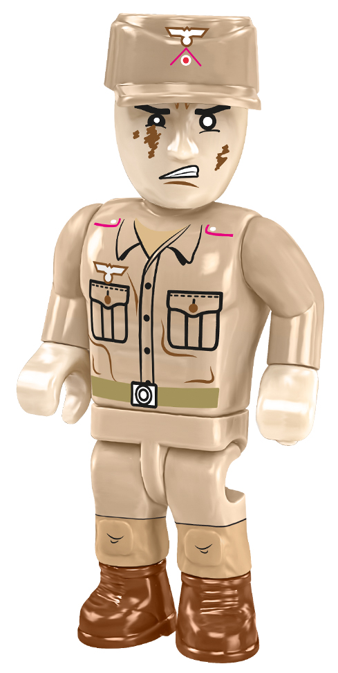 W zestawie znajduje się również inspirowany historycznymi zdjęciami znak drogowy z nazwą miejscowości El Alemein, w której okolicach rozegrały się dwie kluczowe bitwy kampanii w Afryce. Figurki przedstawiają niemieckiego mechanika oraz artylerzystę. Zestaw został opracowany z dbałością o detale i jest również doskonałym rozwinięciem popularnej kolekcji Historical Collection! Fani historii i klocków znajdą tutaj coś dla siebie!