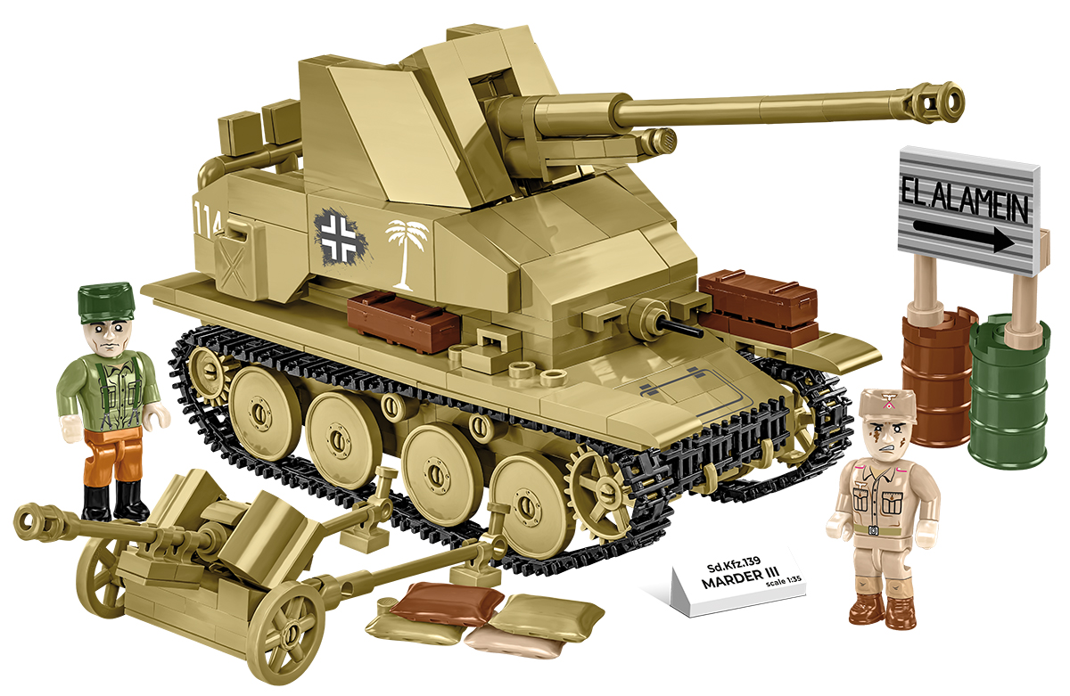 MARDER III w zestawie z dołączoną do zestawu podstawową niemiecką armatą 5cm Pak 38 został opracowany w skali 1:35 pasującej do figurek i składa się z 486 klocków konstrukcyjnych. Tutaj nie ma naklejek, stosujemy wyłącznie wysokiej jakości trwałe nadruki. Funkcjonalności modelu to: działająca trakcja gąsienicowa, obracające się koła, miejsce dla figurki w przedziale bojowym, ruchome działo.