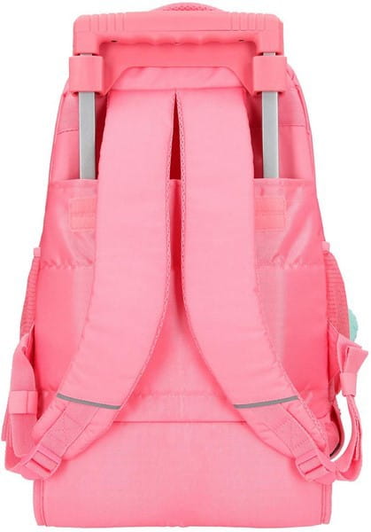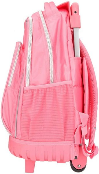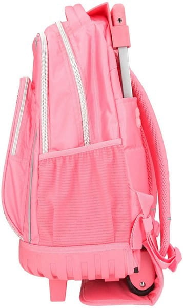 Plecak na kółkach w modnym wzornictwie Fantasy Model. Posiada dużą komorę główną, przednią kieszeń i po bokach torby siatkowe na butelki. Dzięki wodoodpornym materiałom zewnętrznym zawartość jest bezpieczna i pozostanie sucha. Wyściełane ramiączka o regulowanej wysokości i oddychająca wyściółka zapewniają maksymalny komfort noszenia. Aby używać plecaka jako wózka, teleskopowy uchwyt jest wyciągany i można tornister wygodnie prowadzić.