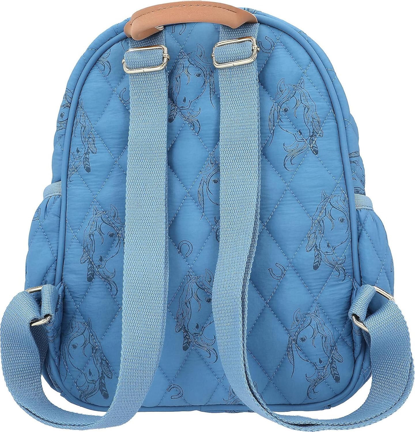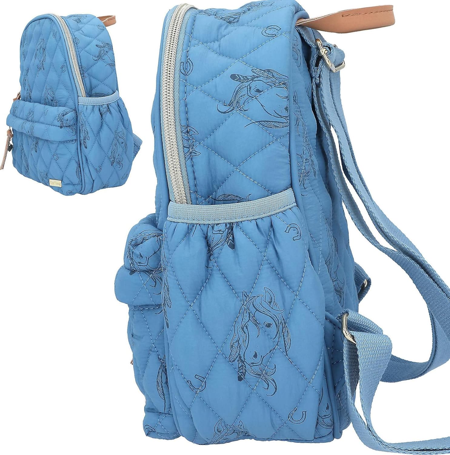 Wzór: Miss Melody Blue Quilt by Depesche - w jasnym niebieskim kolorze, z nadrukiem konia i podkowy, pikowanym szwem oraz jasnobrązowym uchwytem o wyglądzie skóry