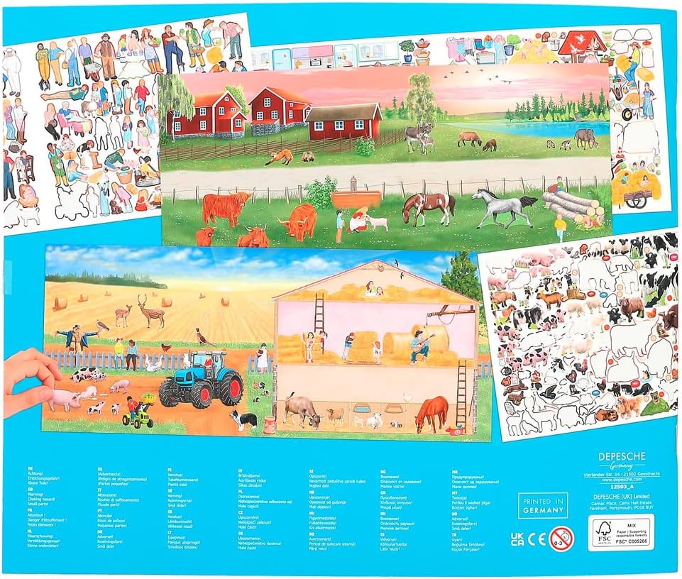 • Kreatywna książka z 24 stronami i 3 podwójnymi stronami pełnymi naklejek do ozdabiania i uzupełniania własnych gospodarstw rolnych i pastwisk