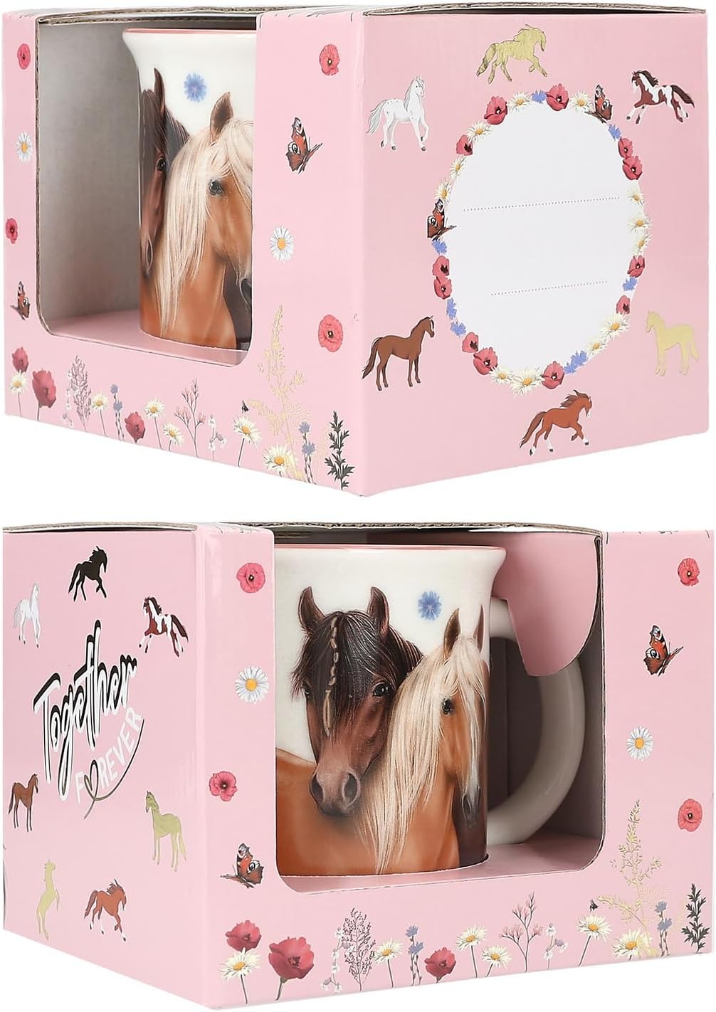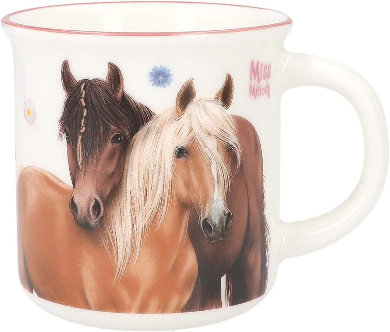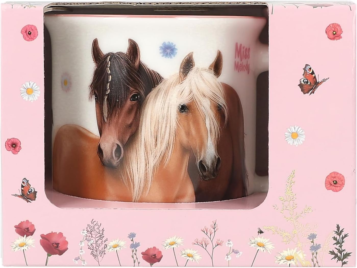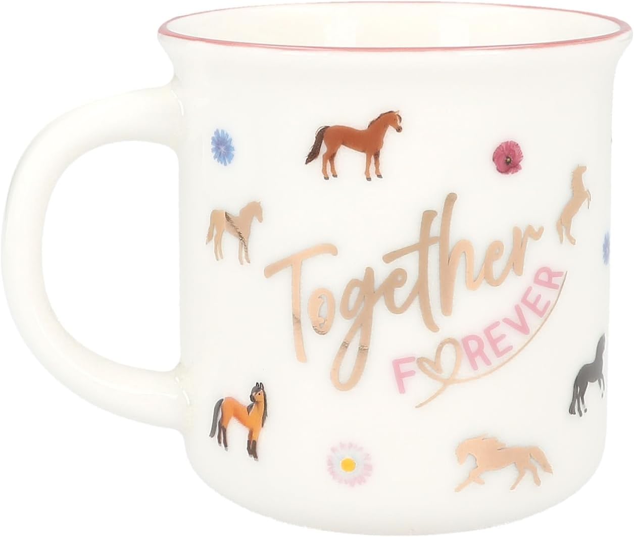 Wzór: Miss Melody Flowers marki Depesche – emaliowane, z motywem konia, kwiatami, różową krawędzią napoju i złotym nadrukiem „Together Forever”