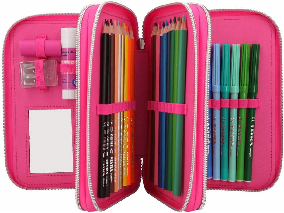 • Wypełniony 18 kolorowymi kredkami i 18 flamastrami firmy Lyra oraz dużą ilością akcesoriów.
