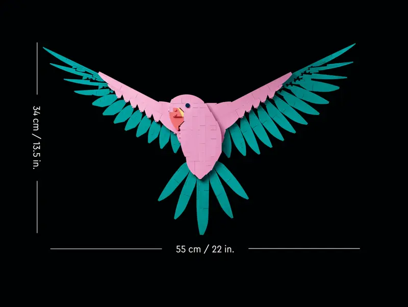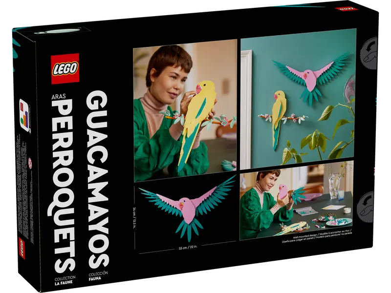 Ta stylowa i wielowymiarowa grafika z klocków przedstawia dwie egzotyczne papugi ary — żółtą papugę siedzącą na gałęzi ozdobionej kwiatami i różową w locie z rozpostartymi skrzydłami. Do zestawu dołączono dwie instrukcje budowania, dzięki czemu dorośli fani LEGO mogą pracować nad papugami z kimś bliskim, spędzając razem relaksujące chwile.