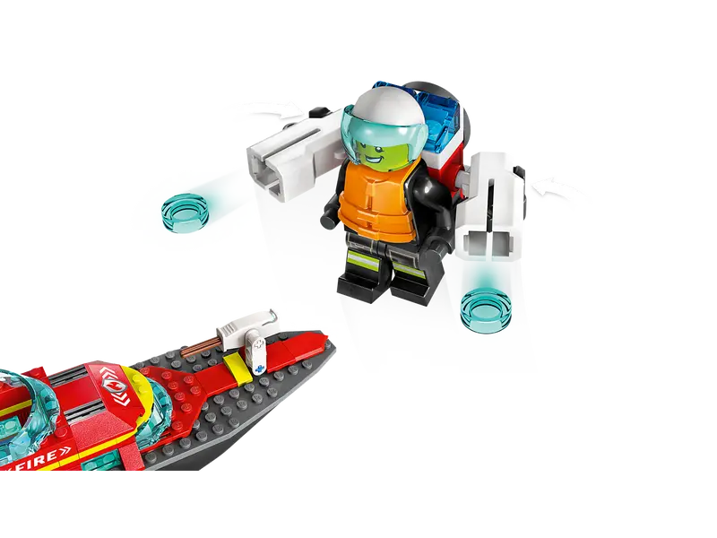 W tym zestawie LEGO® City Łódź strażacka (60373), w którym jest fajna łódź strażacka i motorówka, czekają na dzieci ekscytujące strażackie przygody. Dzieci mogą wyrzucać klocki imitujące wodę z gaśnicy i użyć plecaka odrzutowego, by ugasić płomienie. Wystarczy dodać trzy minifigurki i można zaczynać zabawę.