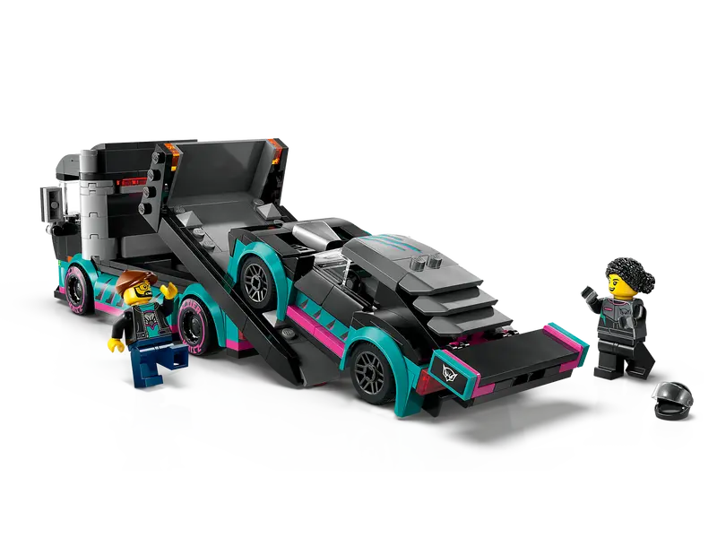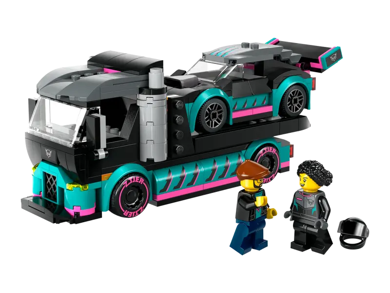 Podkręć emocje dzięki zestawowi LEGO® City Samochód wyścigowy i laweta (60406)! To idealny prezent dla małych miłośników samochodów i ciężarówek w wieku od sześciu lat. Zawiera on ciężarówkę wyścigową z działającą rampą załadunkową oraz fajną wyścigówkę z obniżonym zawieszeniem i szerokimi błotnikami. W zestawie znajdują się też minifigurki kierowcy wyścigowego i kierowcy ciężarówki do odgrywania ról i rozmaitych przygód.