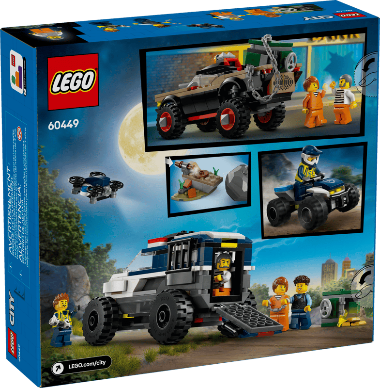 Wciśnij gaz do dechy i rozpocznij przygodę z zestawem LEGO® City Pościg terenówką policyjną (60449). Ten fajny zestaw dla sześciolatków i starszych dzieci zawiera policyjnego SUV-a, quada i drona, a także potężnego pickupa złodziejaszka i skradziony sejf pełen zabawkowych sztabek złota i diamentów. Wystarczy dodać minifigurki dwóch policjantów, dwóch złoczyńców i pułapkę z toczącym się głazem, aby rozpocząć wiele godzin wspaniałej zabawy.