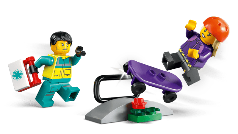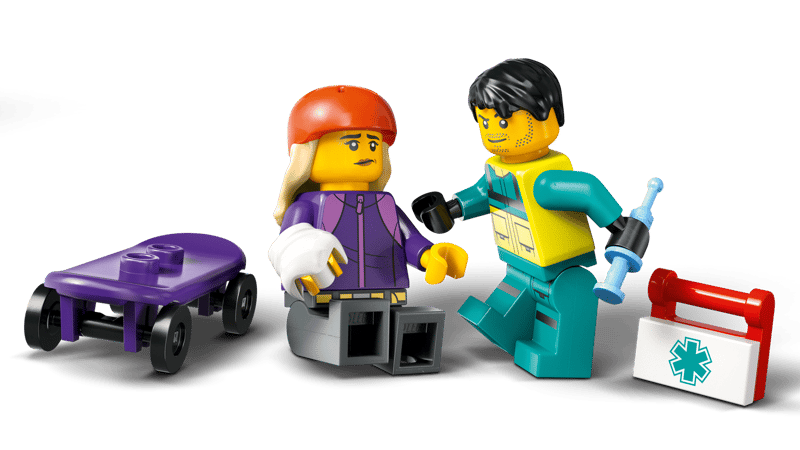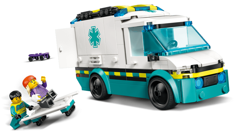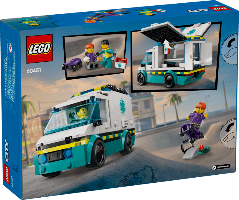 Podczas zabawy zestawem LEGO® City Karetka pogotowia (60451) na pięciolatków i starsze dzieci czekają ekscytujące misje ratunkowe. Dzieci mogą rozłożyć boczne panele i otworzyć tylne drzwi, aby uzyskać łatwy dostęp do noszy i sprzętu medycznego, wtym strzykawki, bandaża i torby medycznej. Zestaw zawiera również deskorolkę i rampę, a także minifigurki deskorolkarza i ratownika medycznego do zabawy w odgrywanie ról i opowiadania historii.