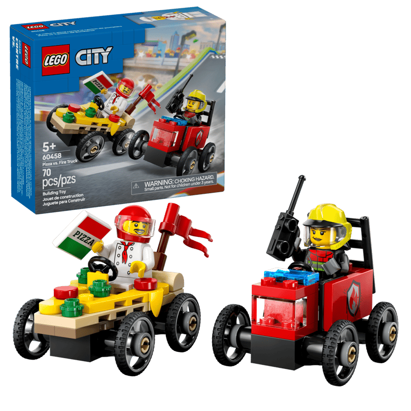 Podaruj pięcioletnim i starszym fanom wyścigów zestaw LEGO® City Zestaw wyścigówek: pizza kontra wóz strażacki (60458). Zawiera on dwie wyścigówki i dwie minifigurki. Dzieci mogą wcielić się w szefa kuchni w gorącym kawałku pizzy lub strażaka w rozgrzanym do czerwoności wozie strażackim. Kto zwycięży? Przekonaj się, biorąc udział w miejskim wyścigu!