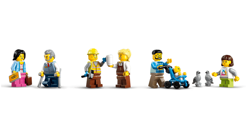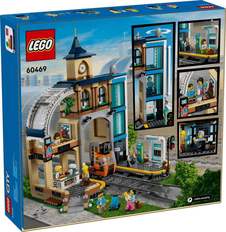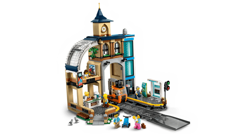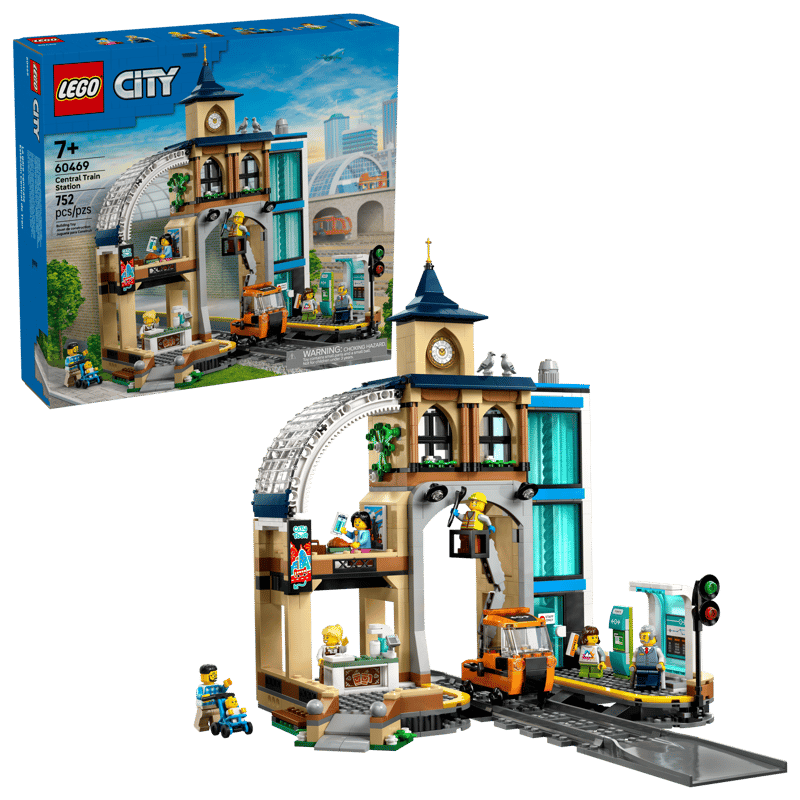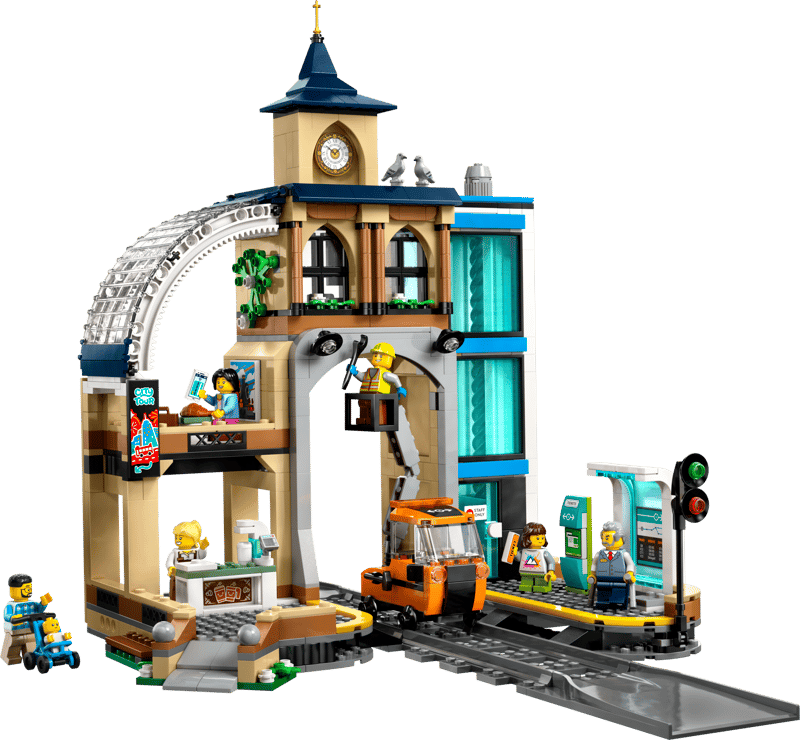 Zestaw LEGO® City Centralny dworzec kolejowy (60469) dla dzieci od 7 lat jest pełen fajnych funkcji rozmieszczonych na trzech poziomach. Zwieńczony klasyczną wieżą zegarową dworzec obejmuje przytulną kawiarnię, działającą windę, sterownię, przystanek autobusowy, dwa perony, wyświetlacz z rozkładem jazdy oraz automat biletowy. W zestawie jest też wagon serwisowy z podnośnikiem koszowym, sześć minifigurek, figurka dziecka i dwie figurki gołębi do odgrywania ról i wymyślania historii.