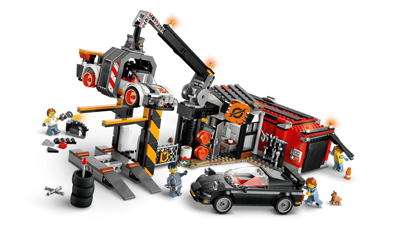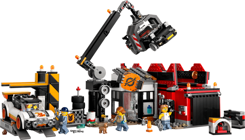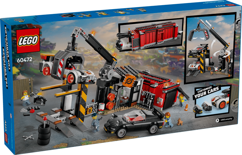 Dzięki zestawowi LEGO® City Złomowisko z samochodami siedmiolatki i starsze dzieci wkroczą do ekscytującego świata recyklingu. Jest on pełny fajnych funkcji, które obejmują działający dźwig z chwytakiem i zgniatarkę, która zamienia pojazdy w kostki po naciśnięciu dźwigni. Dzieci mogą również pomóc w demontażu dwóch klasyków z lat 80. XX wieku i sprzedawać odzyskane części, felgi i opony w starym budynku biurowym. Wystarczy dodać cztery minifigurki pracowników i można zaczynać wspaniałą zabawę!